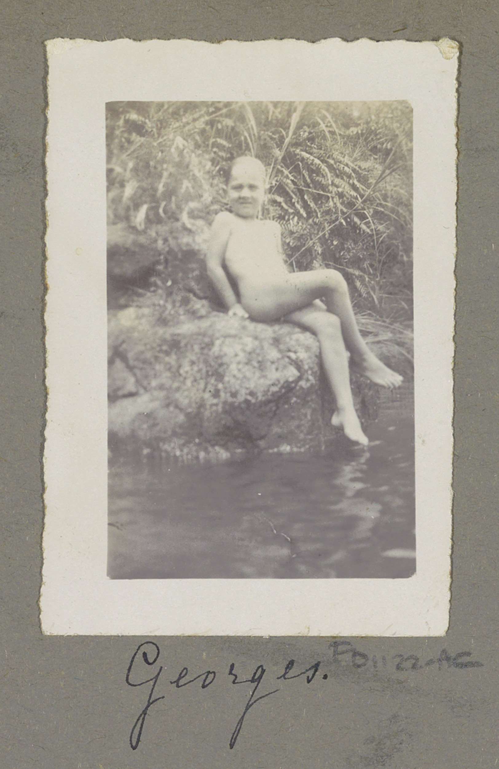 Georges Bergsma zittend op een steen, naakt