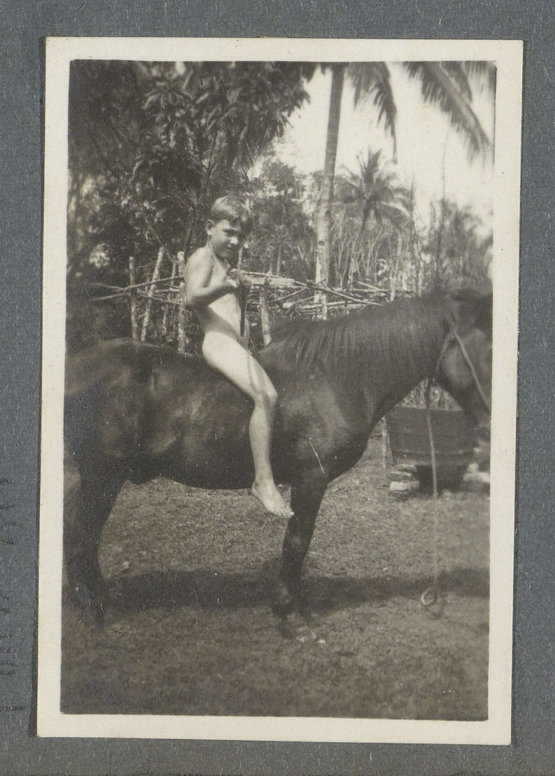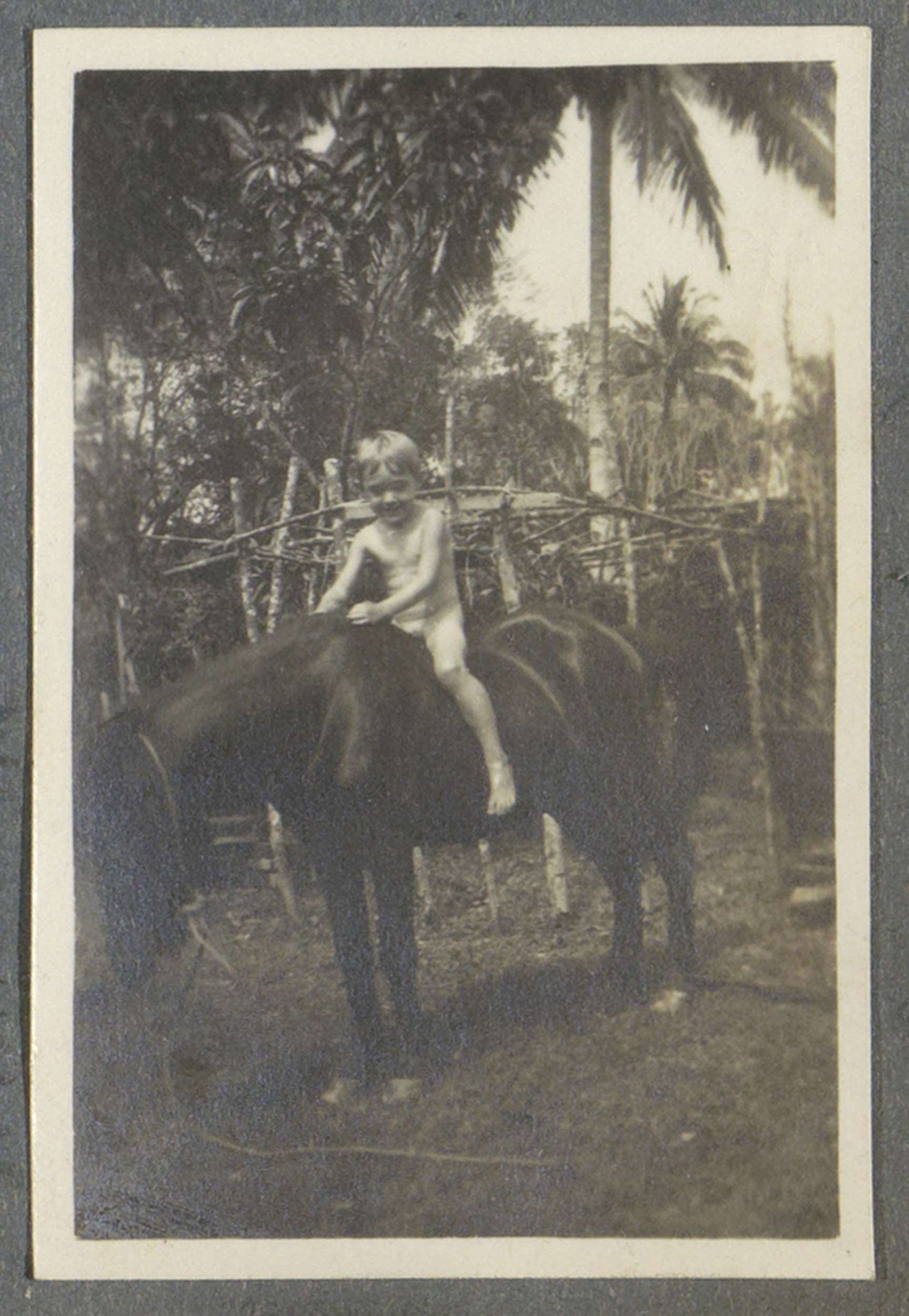 Naakte jongen te paard op Sumatra, vermoedelijk kind...
