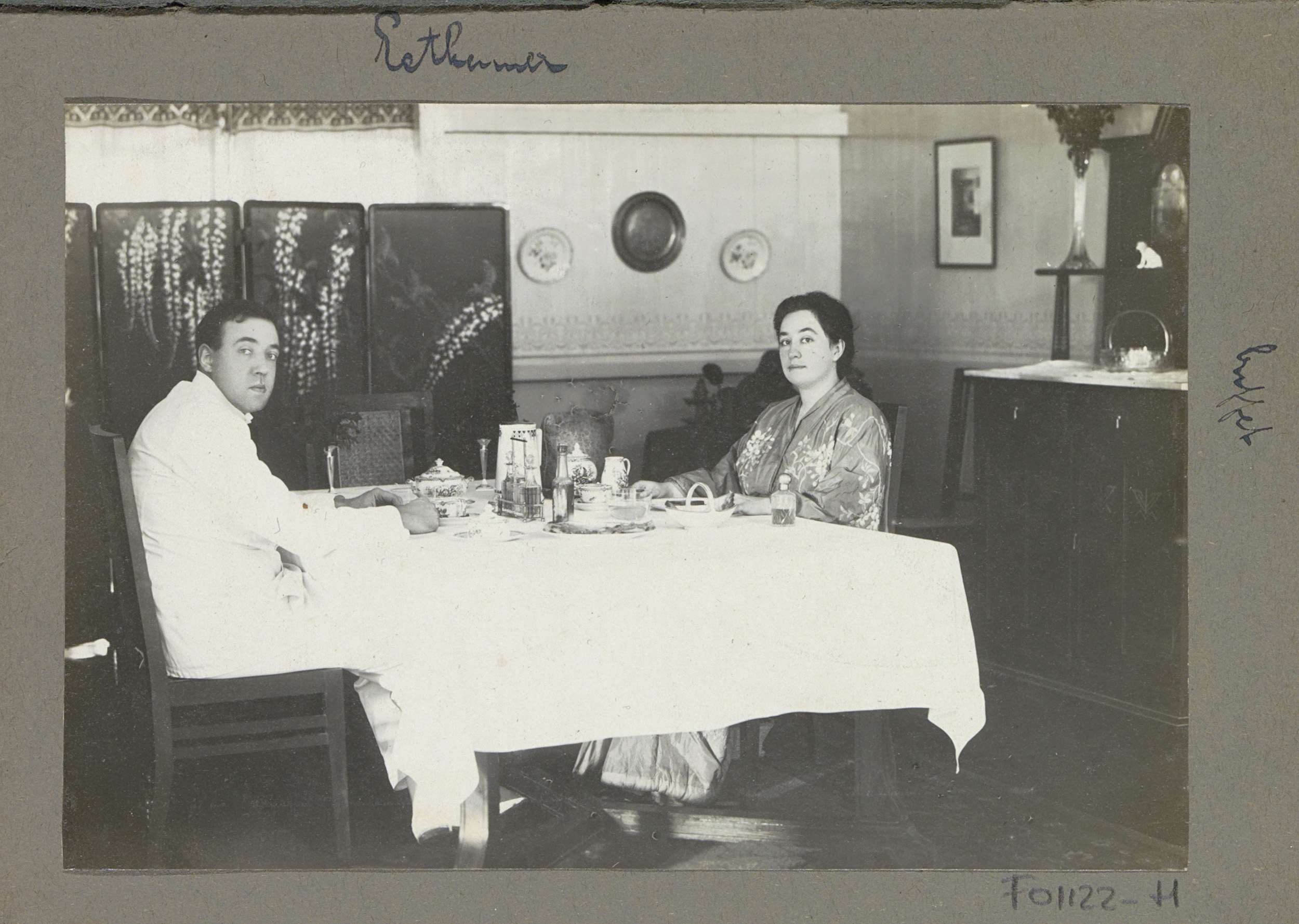 Gerda Bergsma in lang gewaad zittend aan tafel in ee...