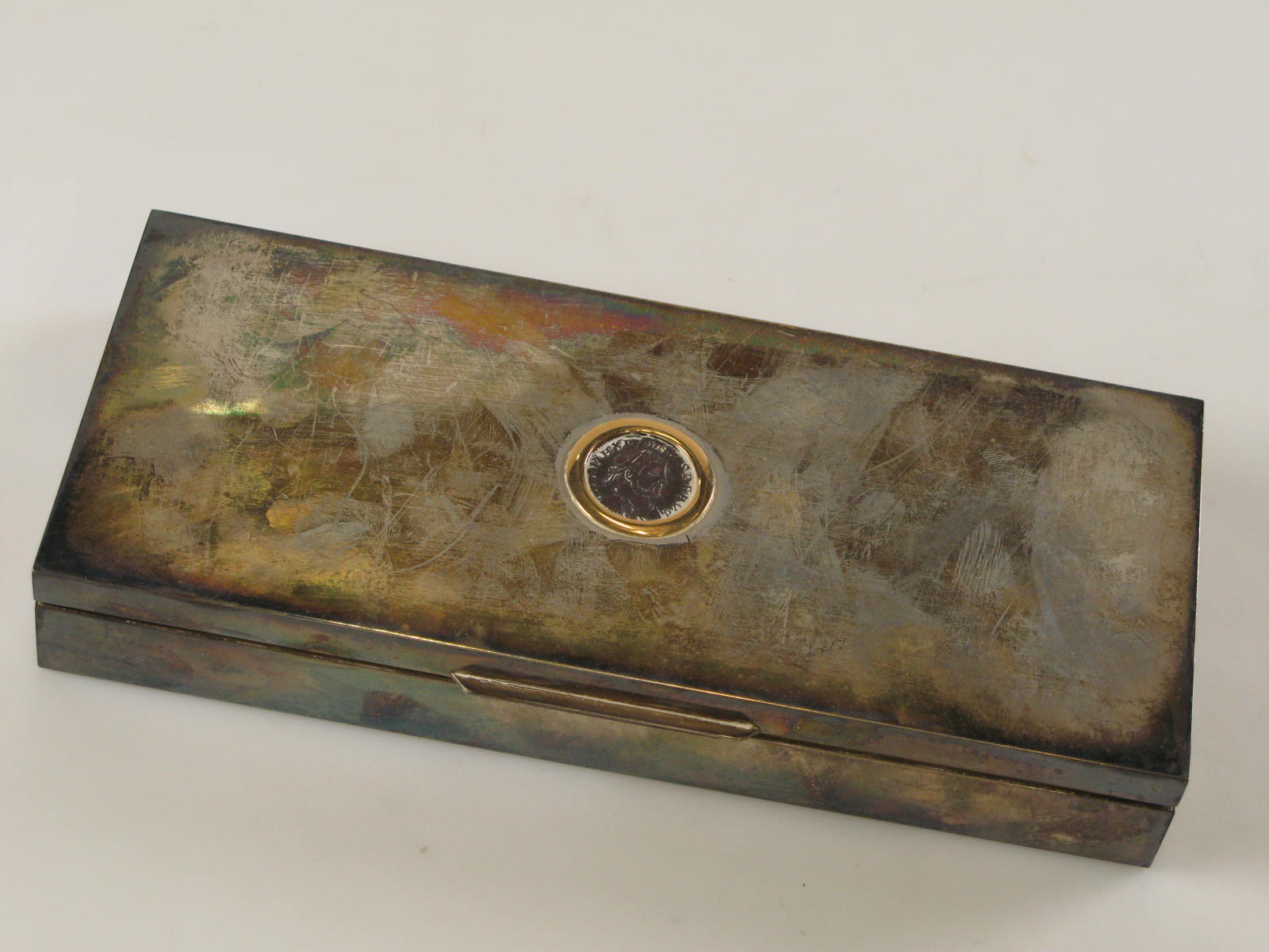 Zilveren sigarendoos met ingelegde antieke munt in d...