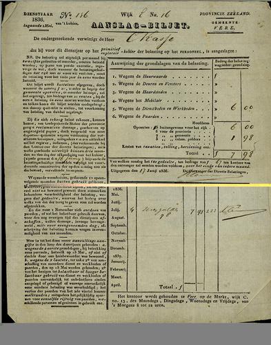 Aanslagbiljet, personele belasting, 1836