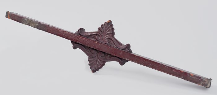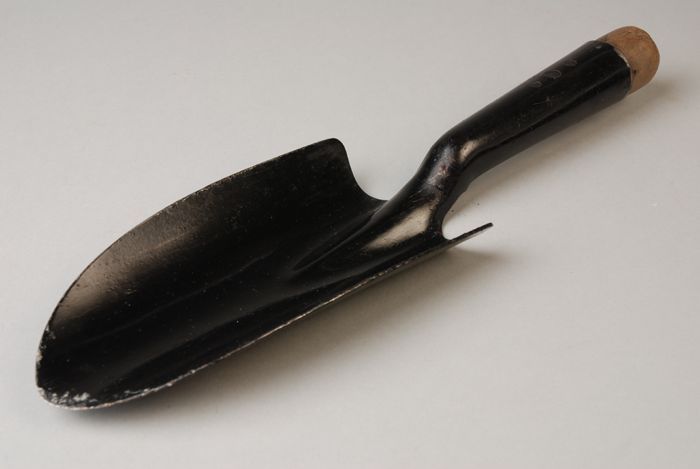 Zwart beaardingsschepje met houten greep, waarmee na...