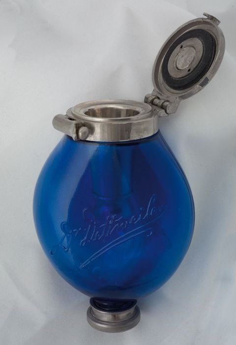 Blauw glazen sputumflacon "Dr Dettweiler" met metale...