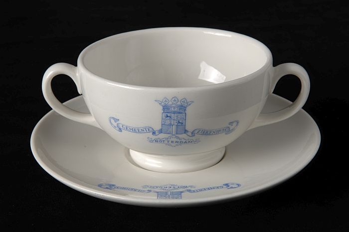 Witte soepkom en schotel met blauw logo Gemeente Zie...