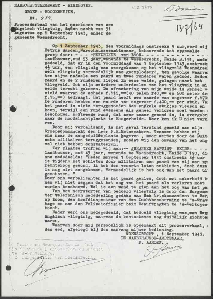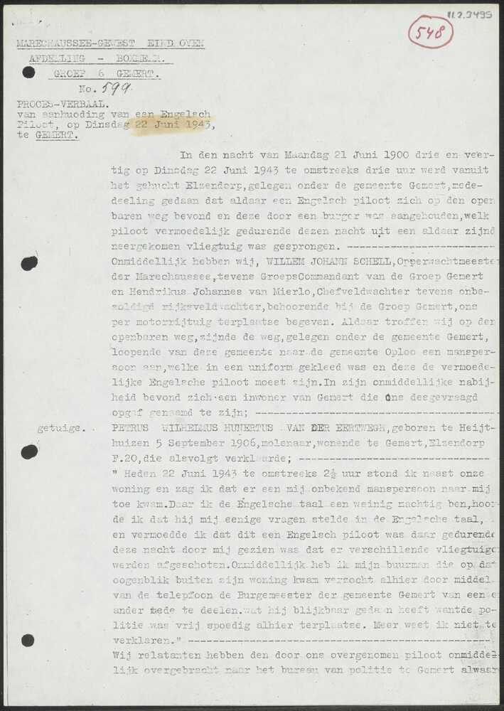 Proces-Verbaal No. 599 Marechaussee Gewest Eindhoven...