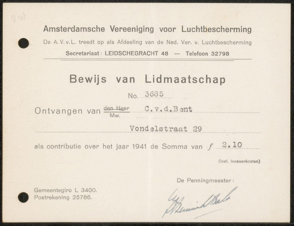 Bewijs van Lidmaatschap Amsterdamsche Vereeniging vo...