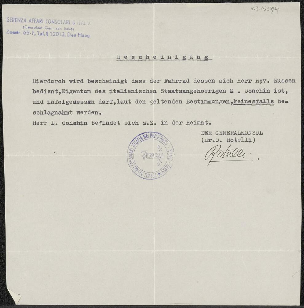Bescheinigung dat de fiets van H.van Hussen eigendom...