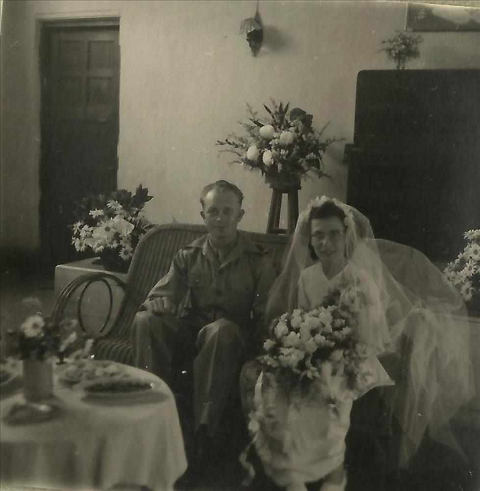 Trouwfoto van een meisje en een Canadese militair ("...