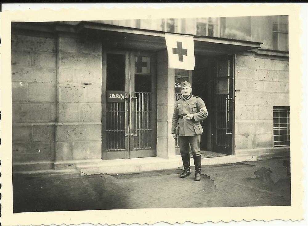 Duitse soldaat voor gebouw met Rode Kruis vlag