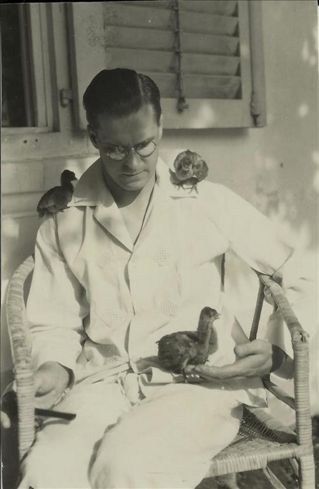 Indië album; koloniale tijd; Man met kuikens in stoel