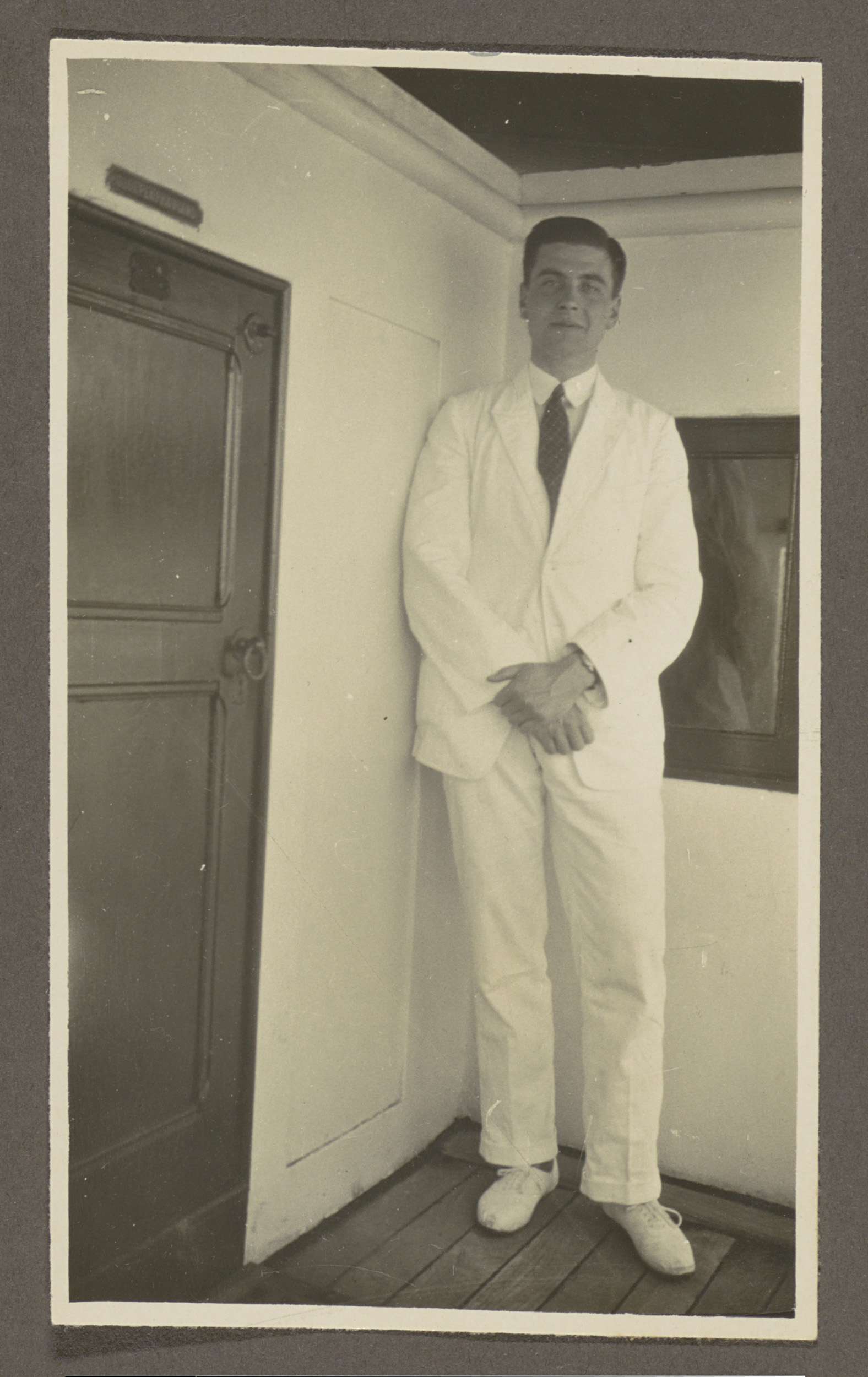 Man poserend in een wit kostuum aan boord van een schip