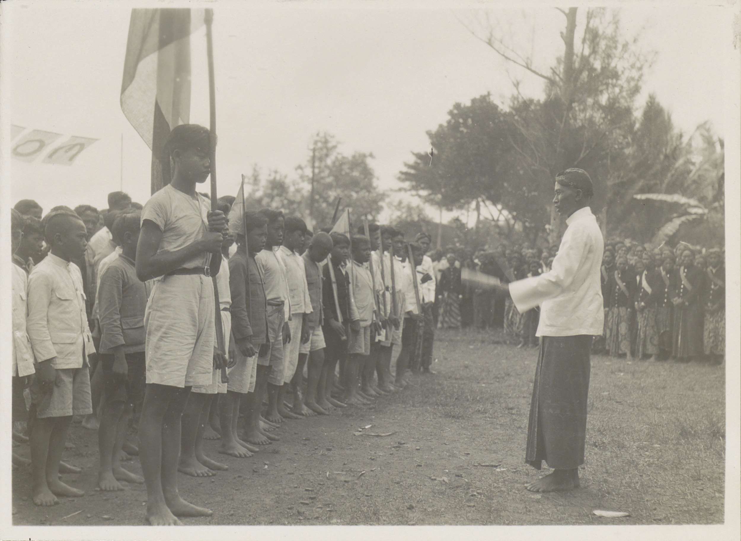 Schoolleerlingen staan in het gelid onder leiding va...