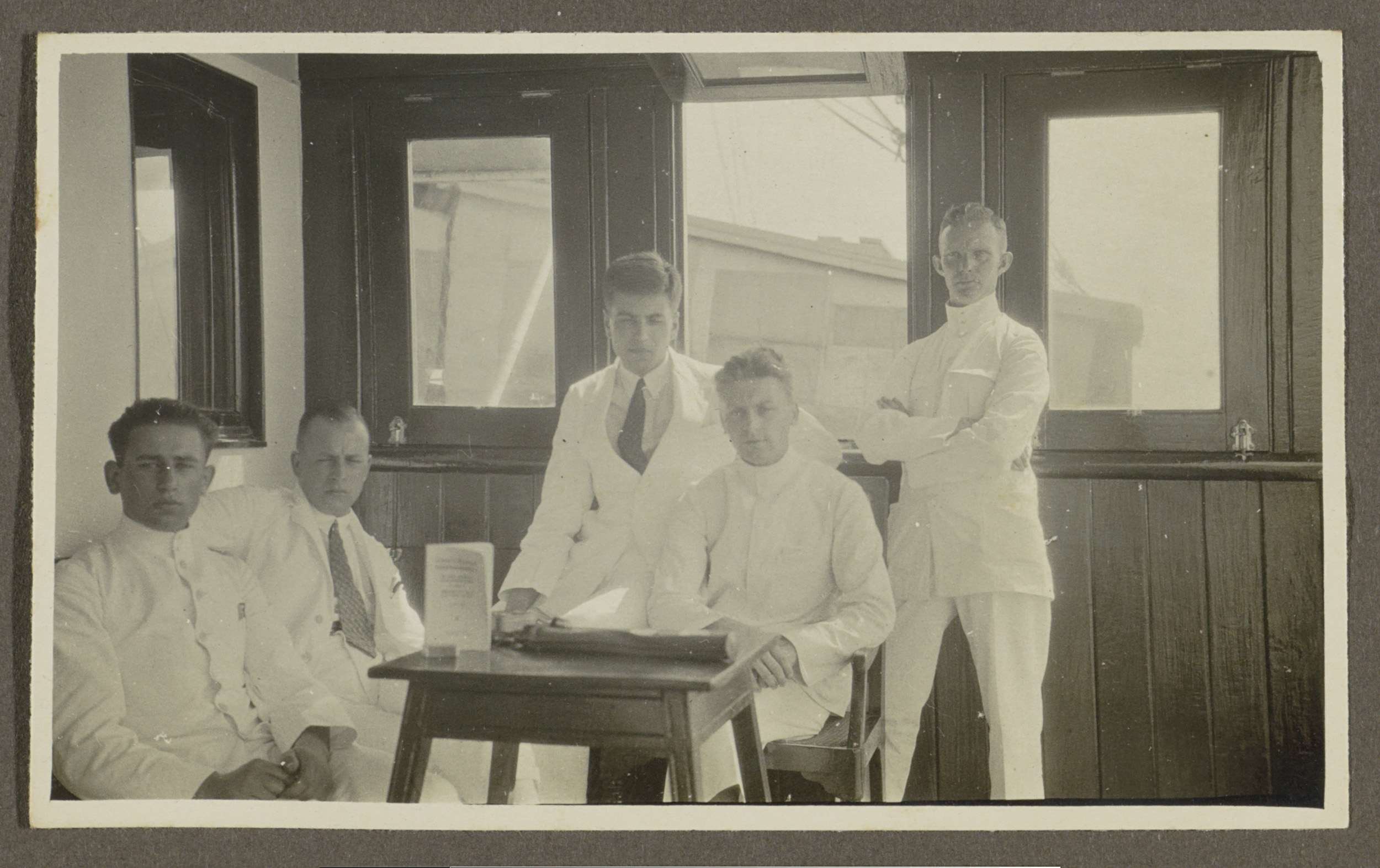 Vijf mannen in tropenkledij zittend rondom een tafel