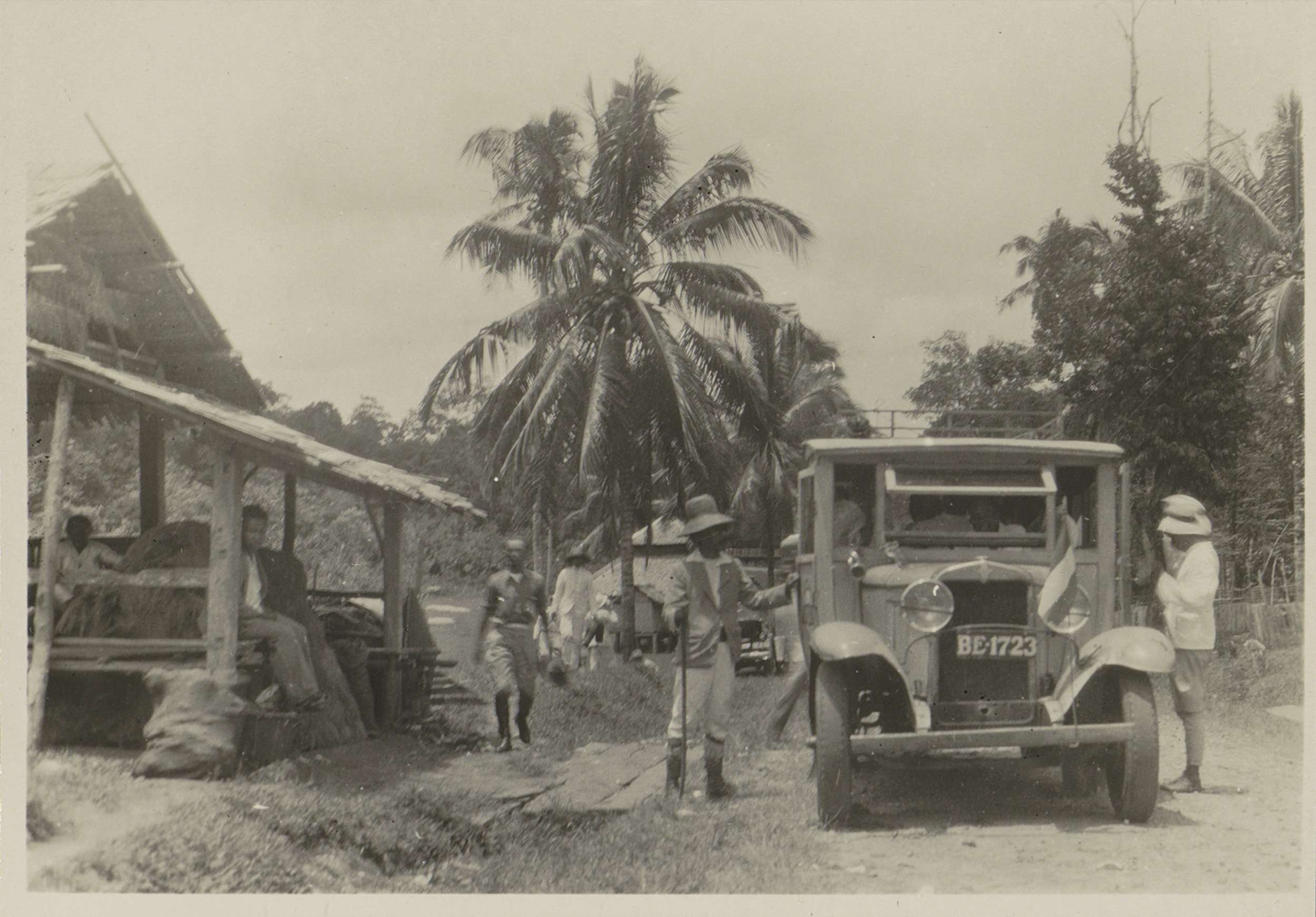 Mannen bij een autobus en wachthuisje