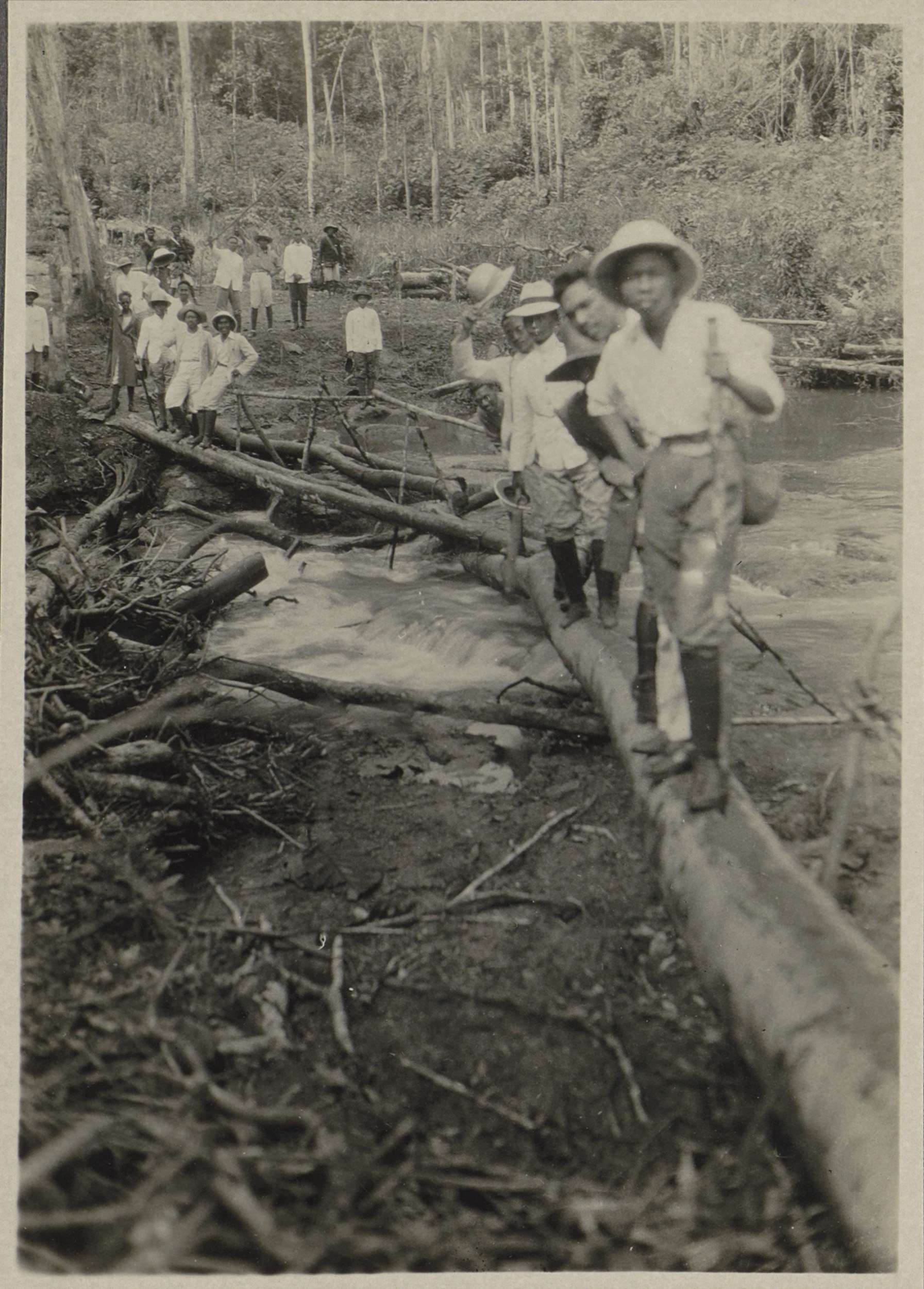 Mannen steken een boomstambrug over