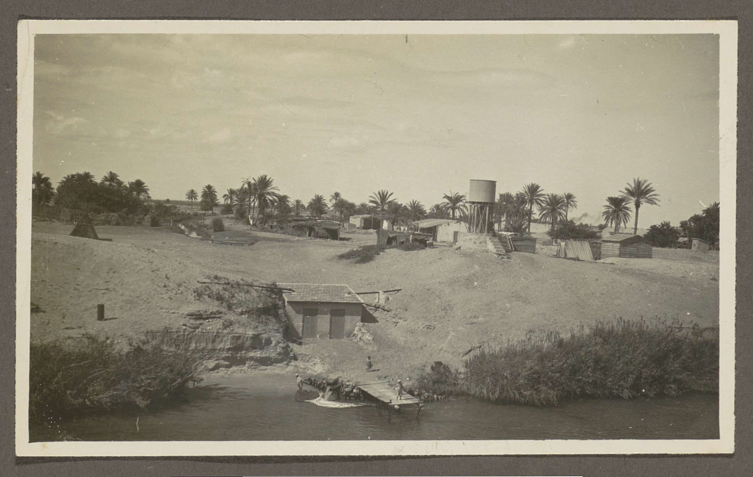 Zicht op een dorp met een waterbassin en palmen aan ...