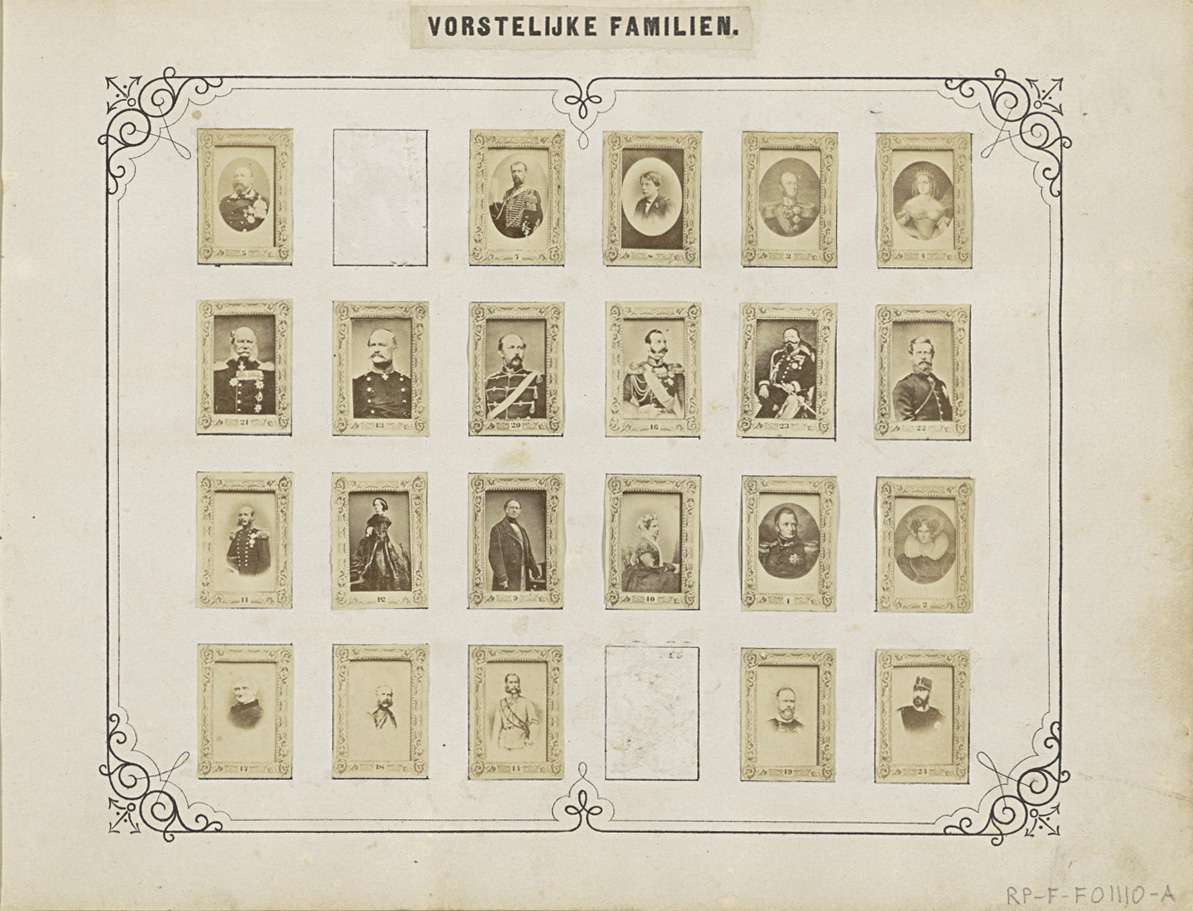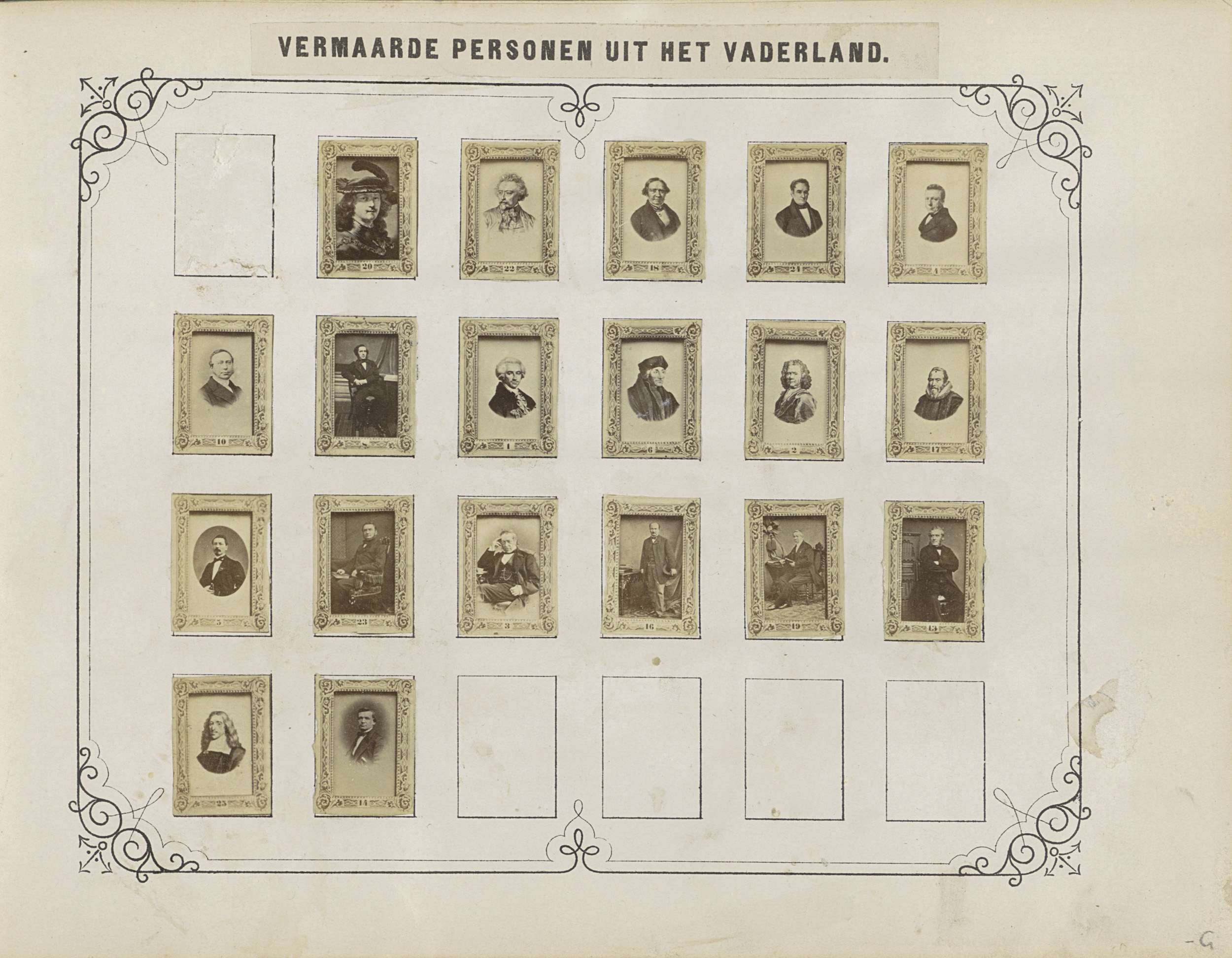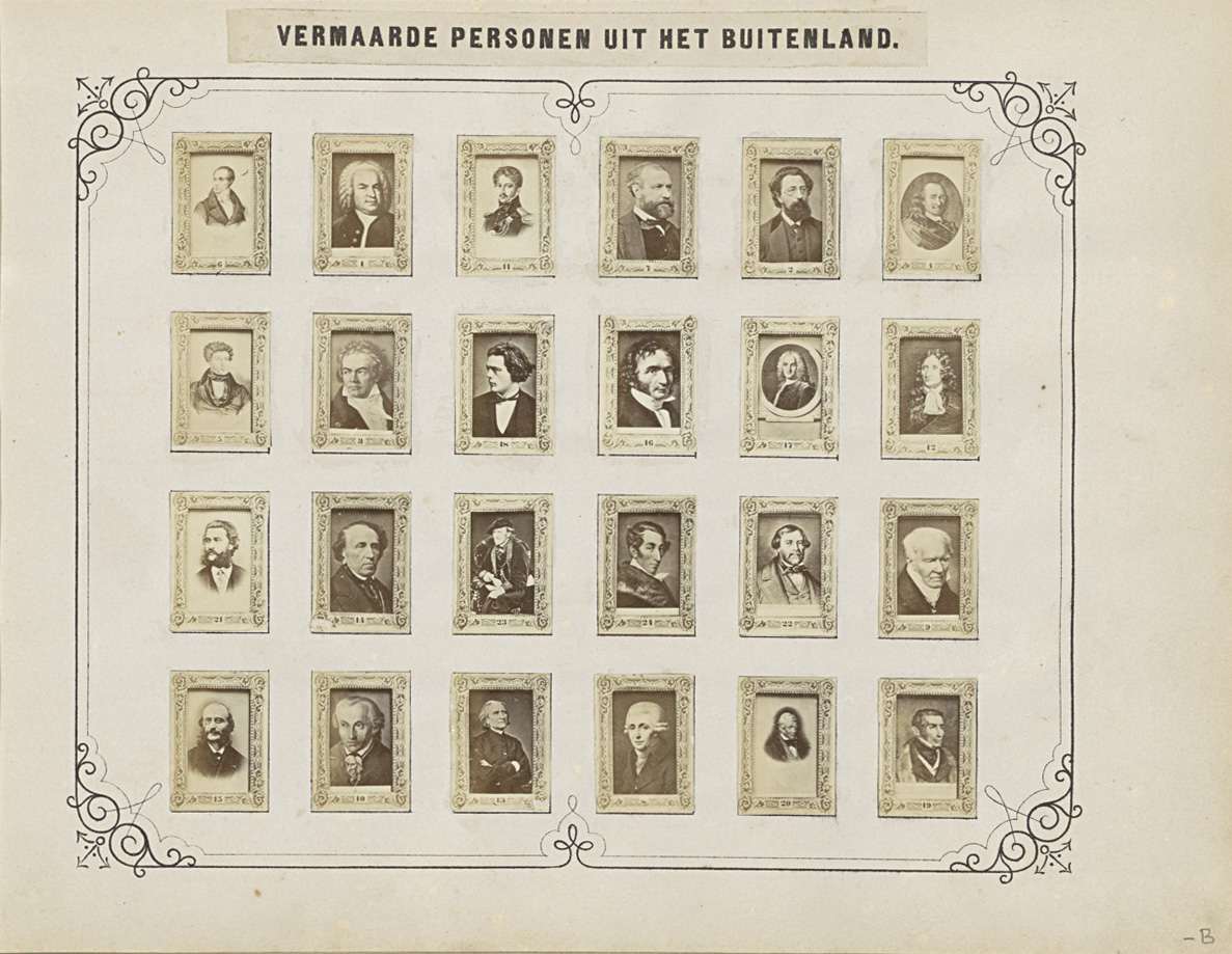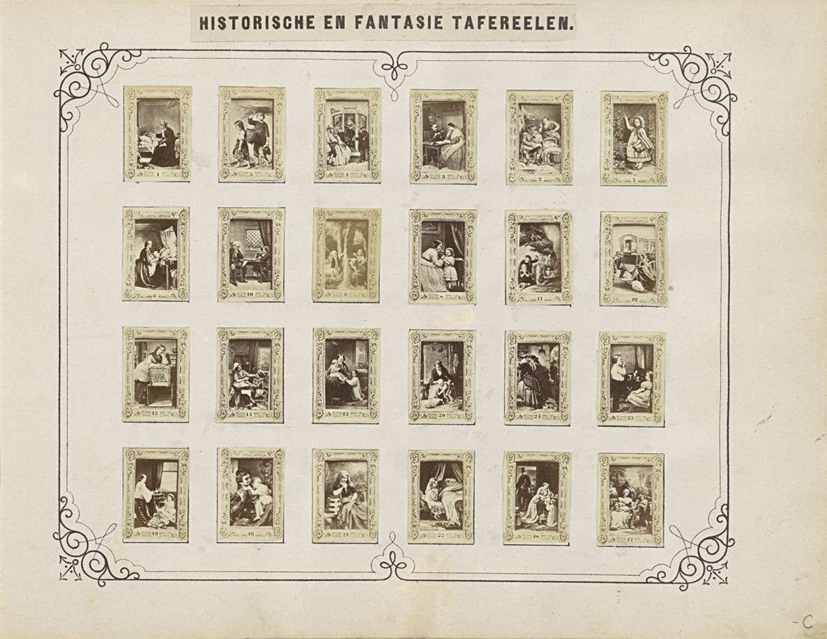 Twee albumbladen met namen en afbeeldingen van histo...