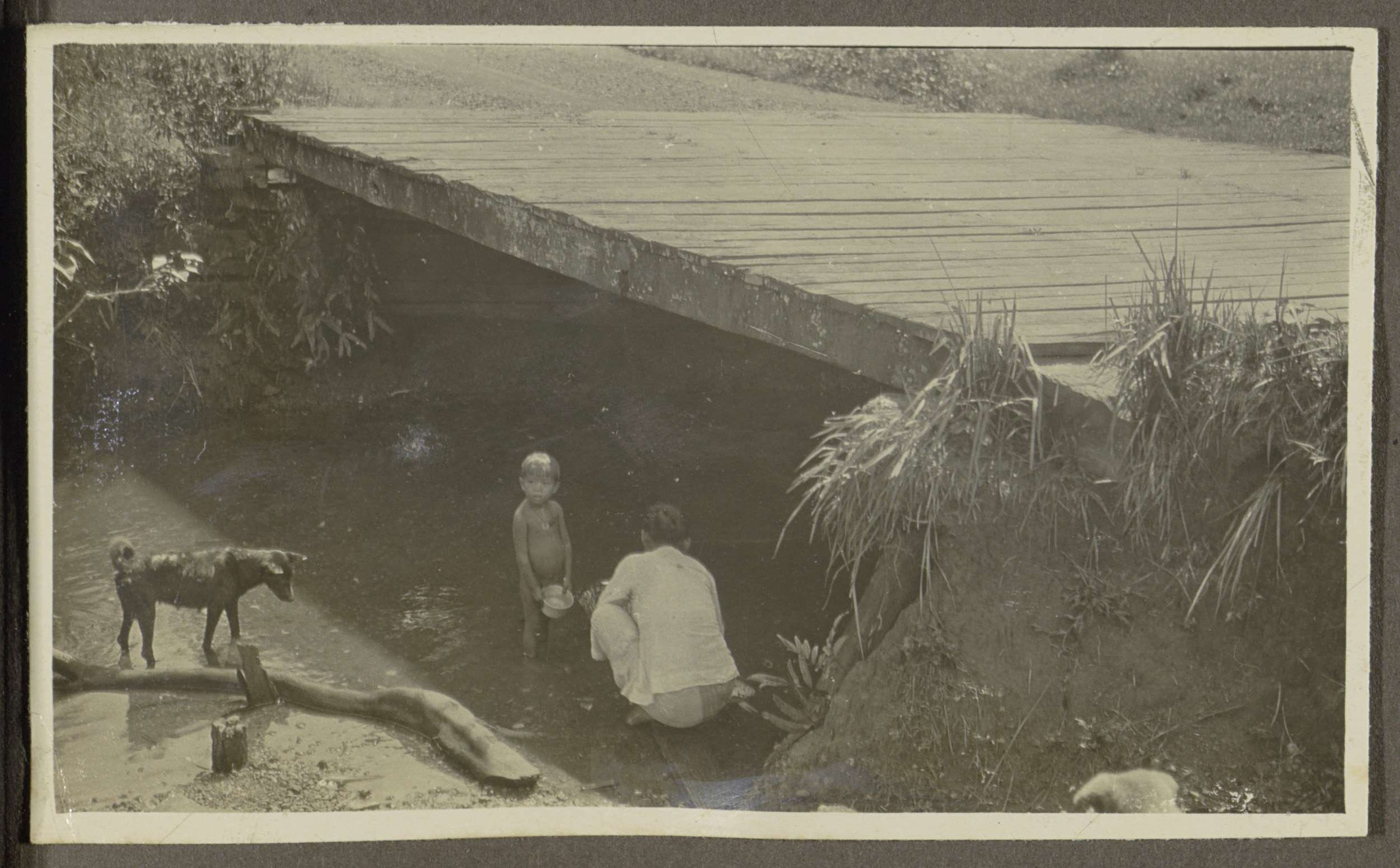 Vrouw, een kind en een hond aan de oever van een beek