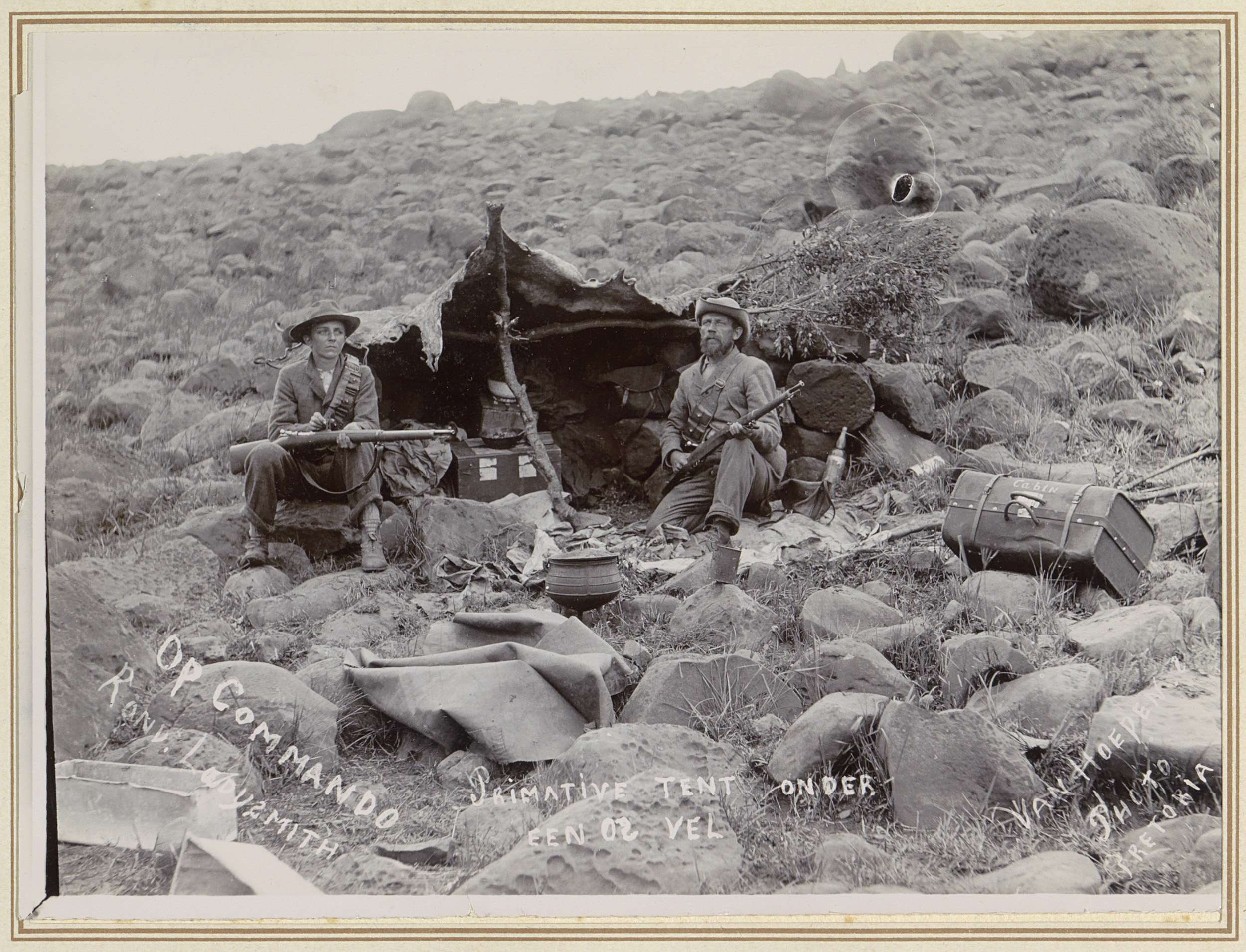 Twee soldaten onder een ossenvel bij Ladysmith