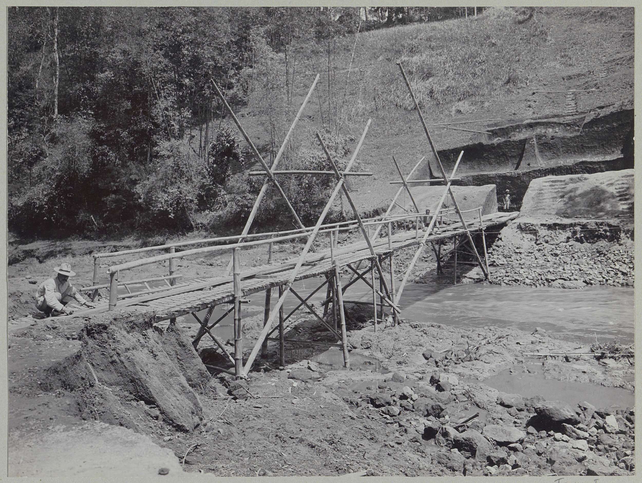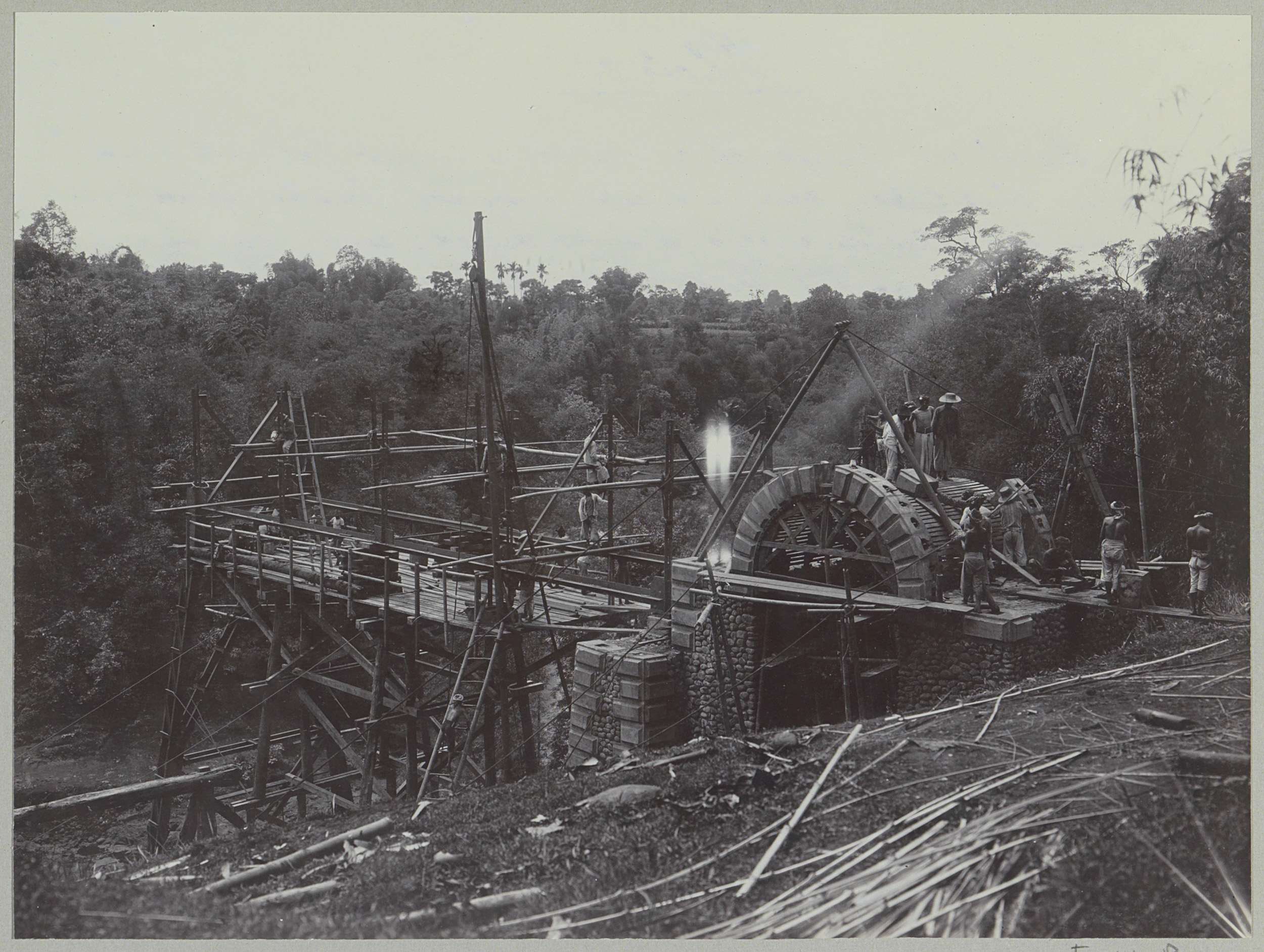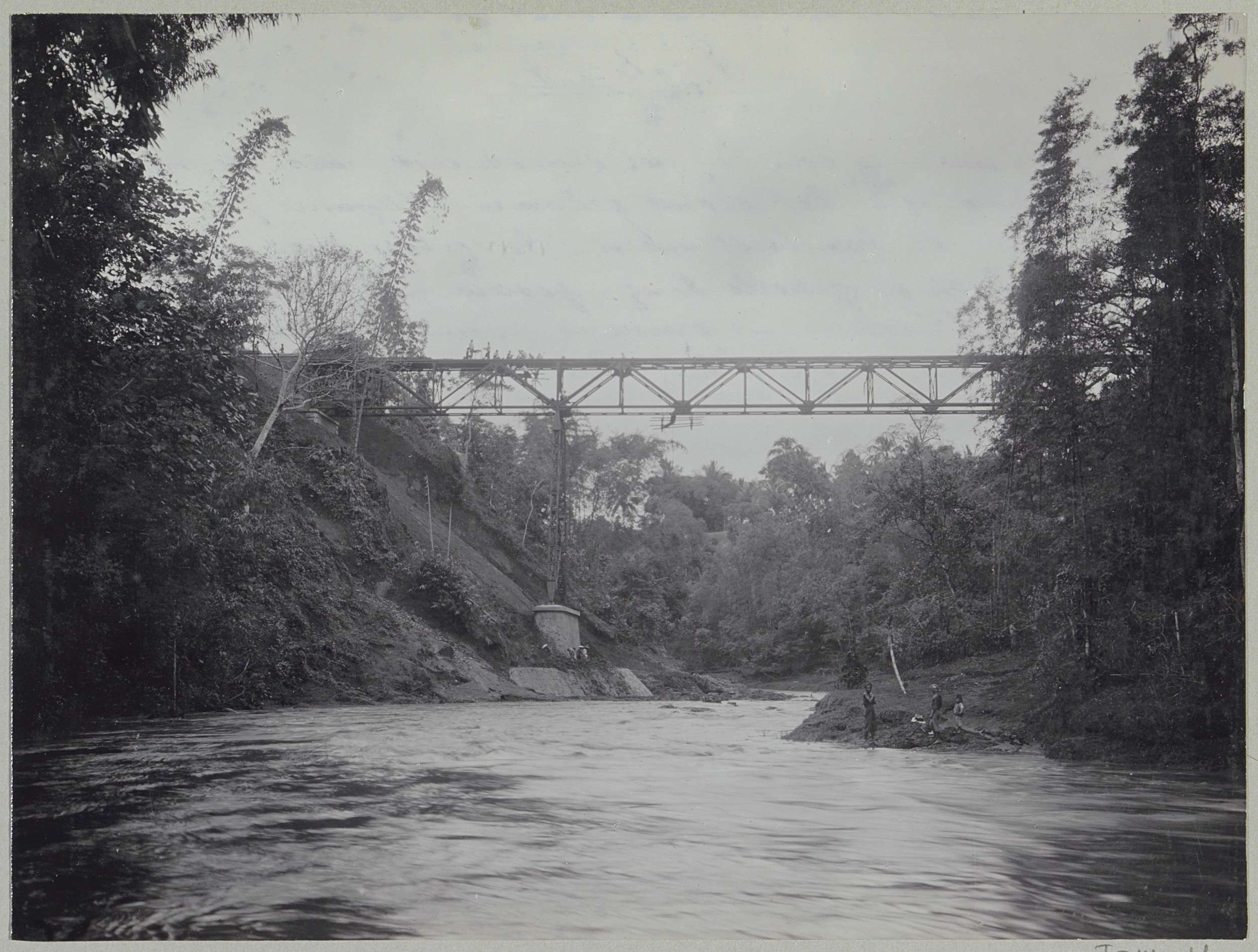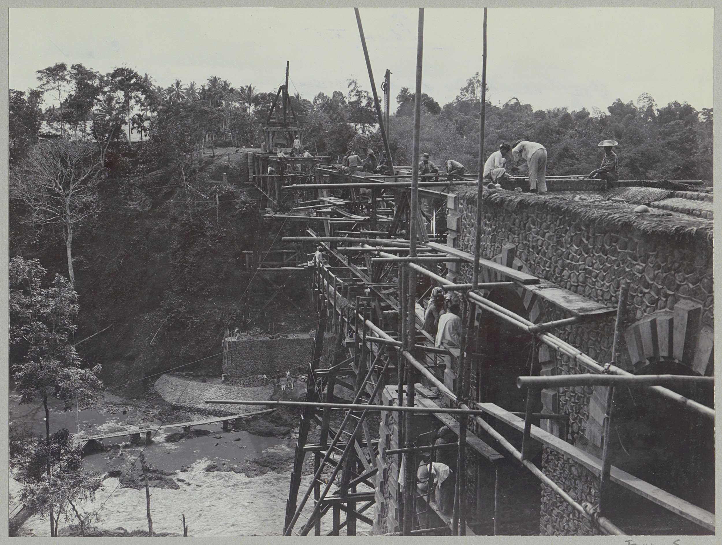 Javaanse arbeiders op een afgebouwde brug over de Ka...
