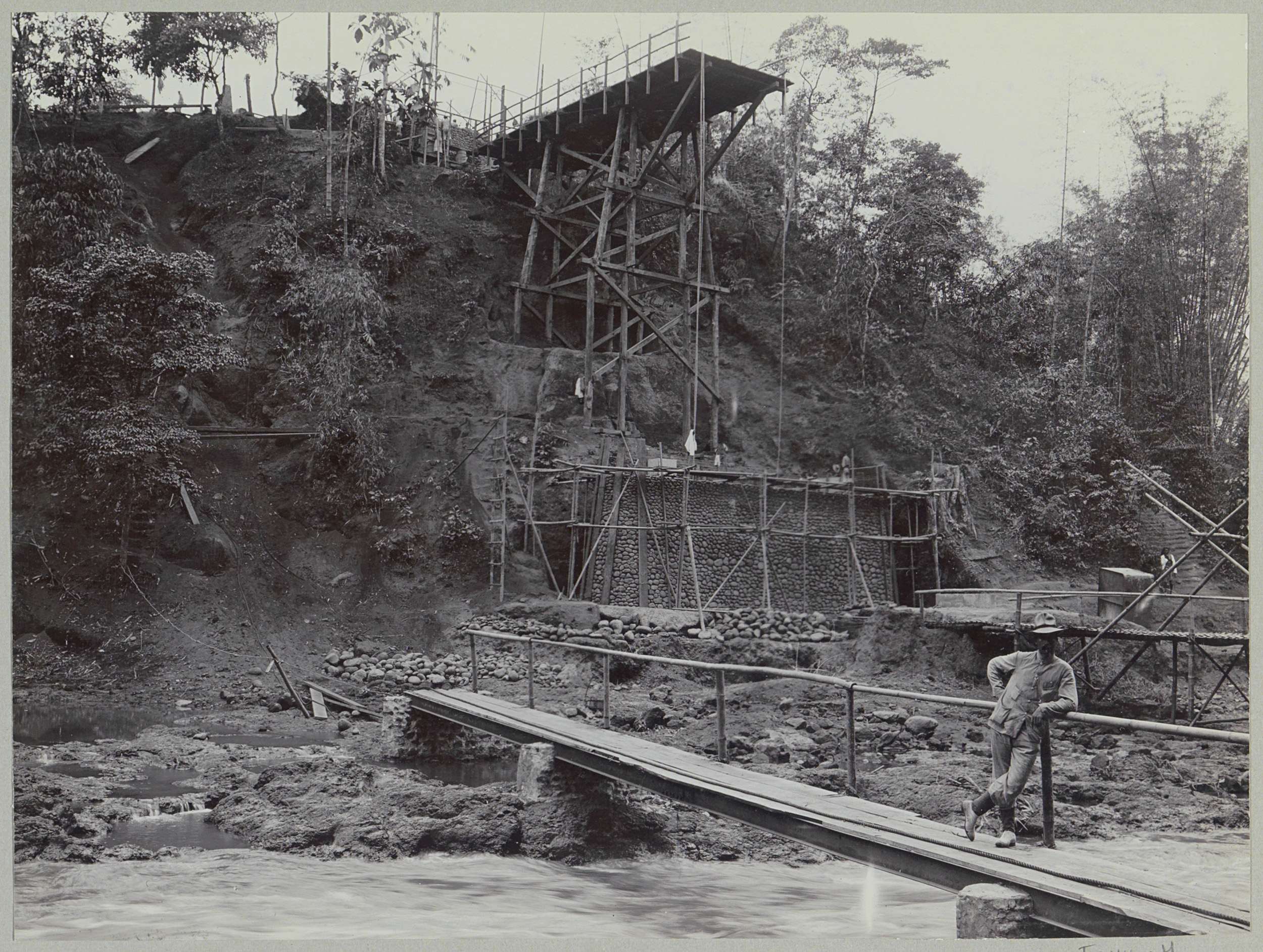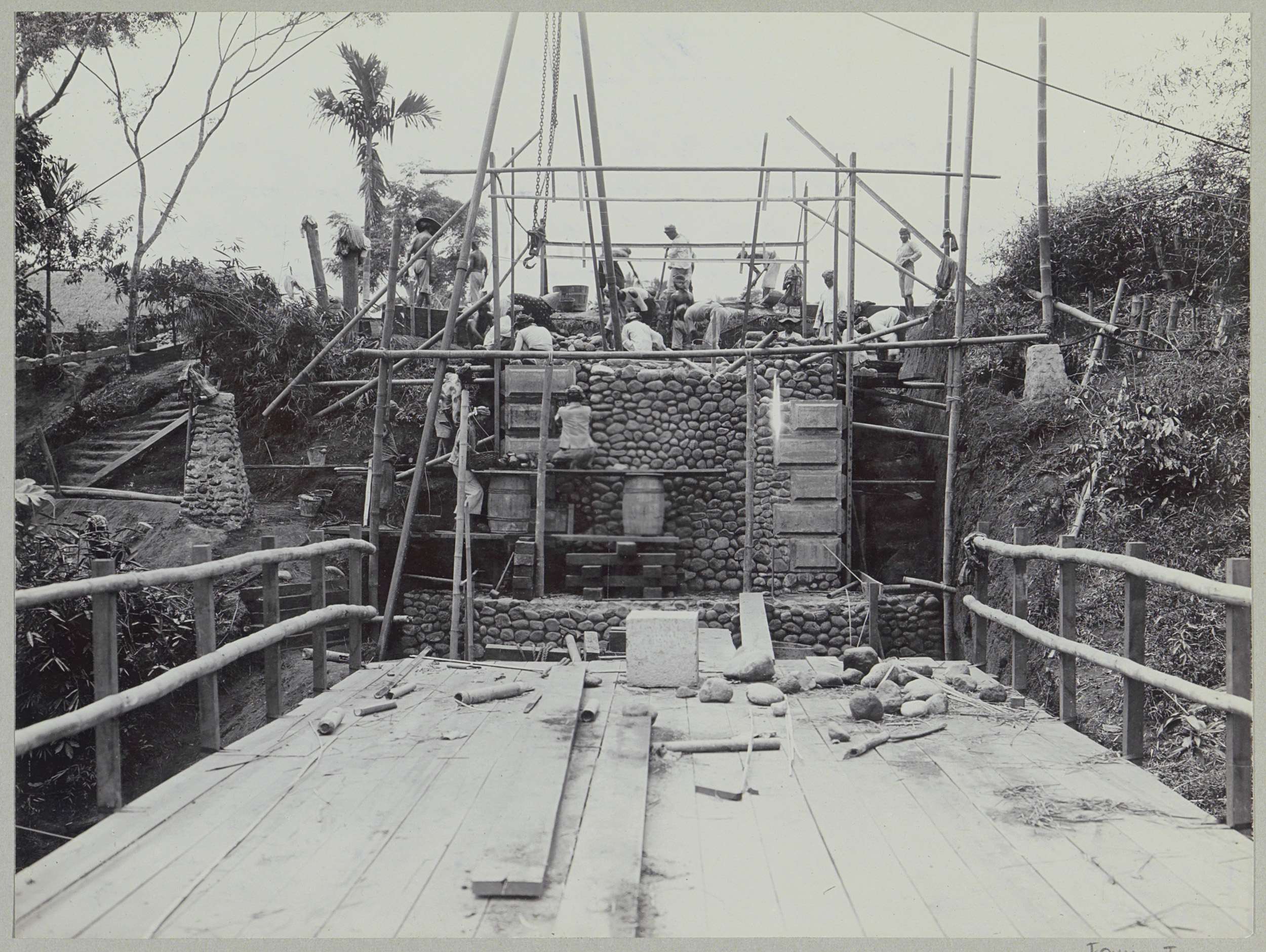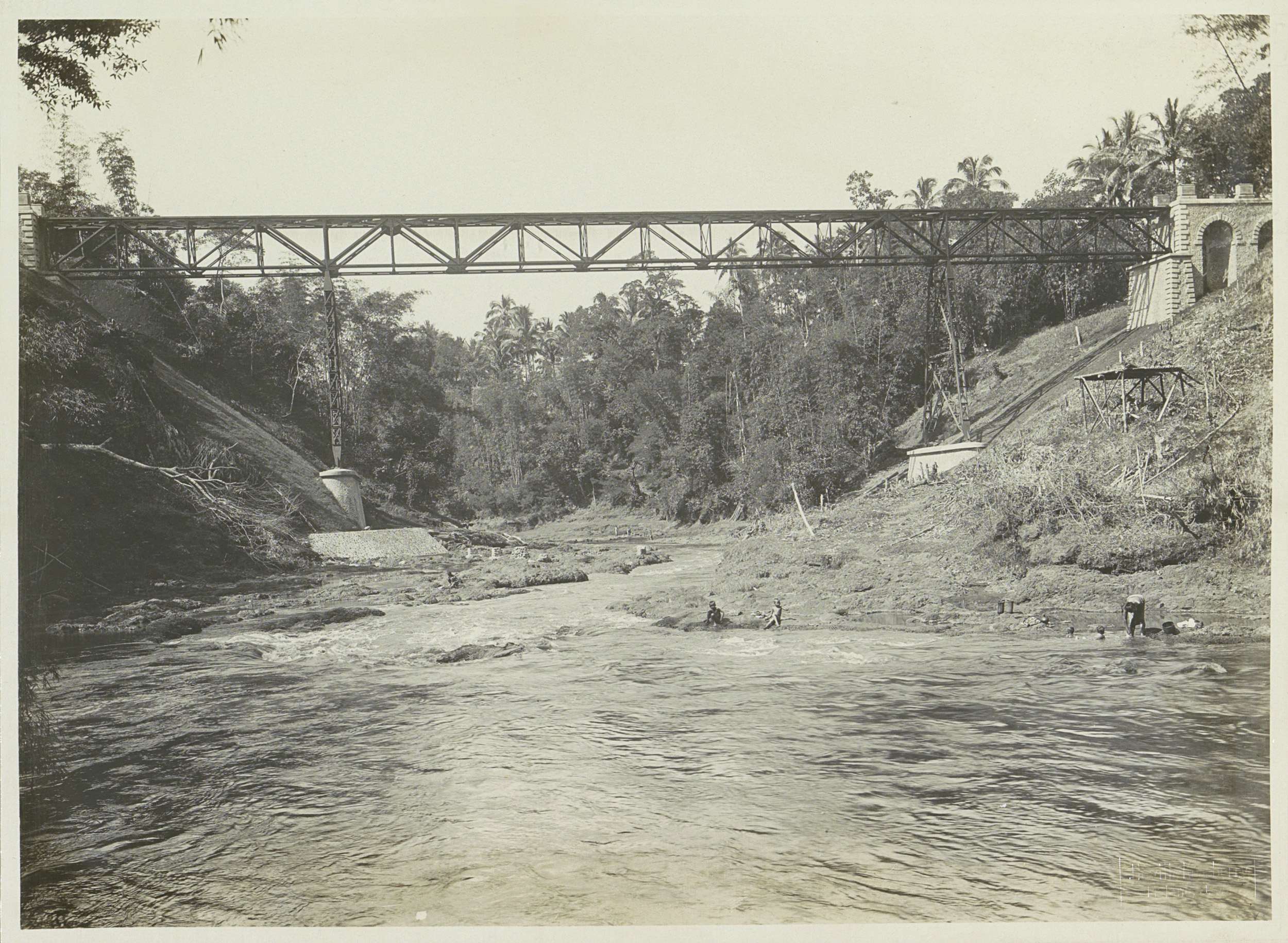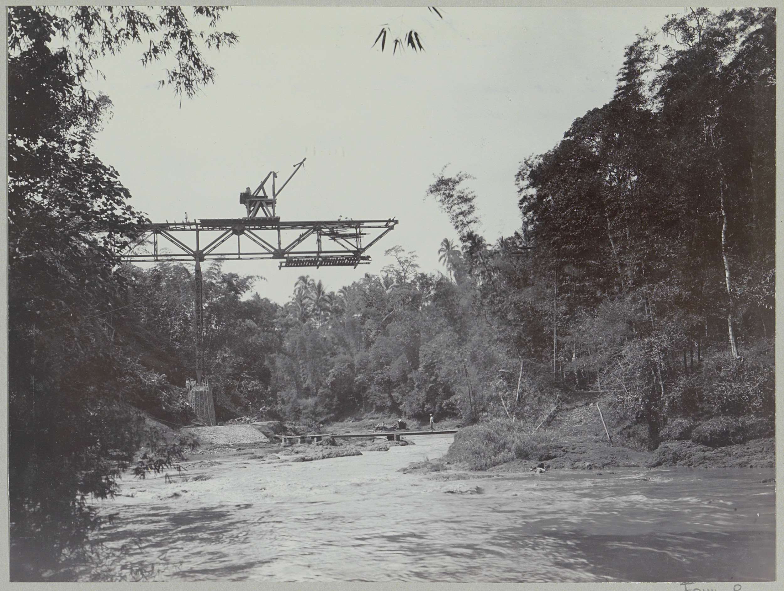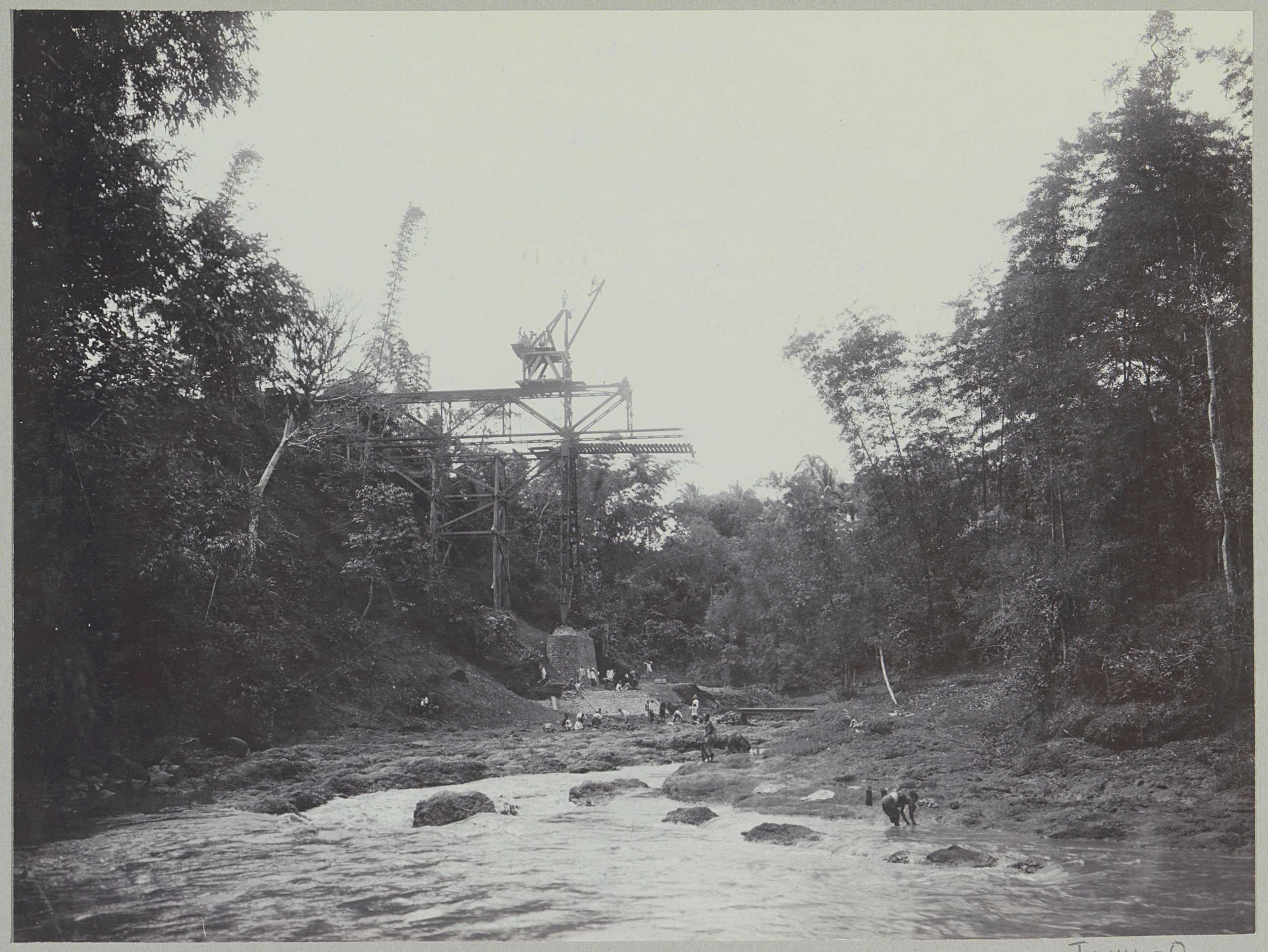 Javaanse arbeiders op een afgebouwde brug over de Ka...