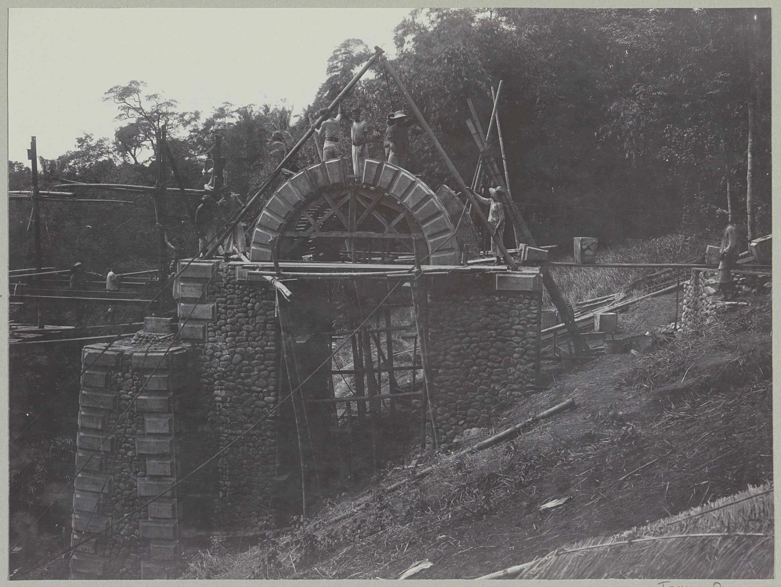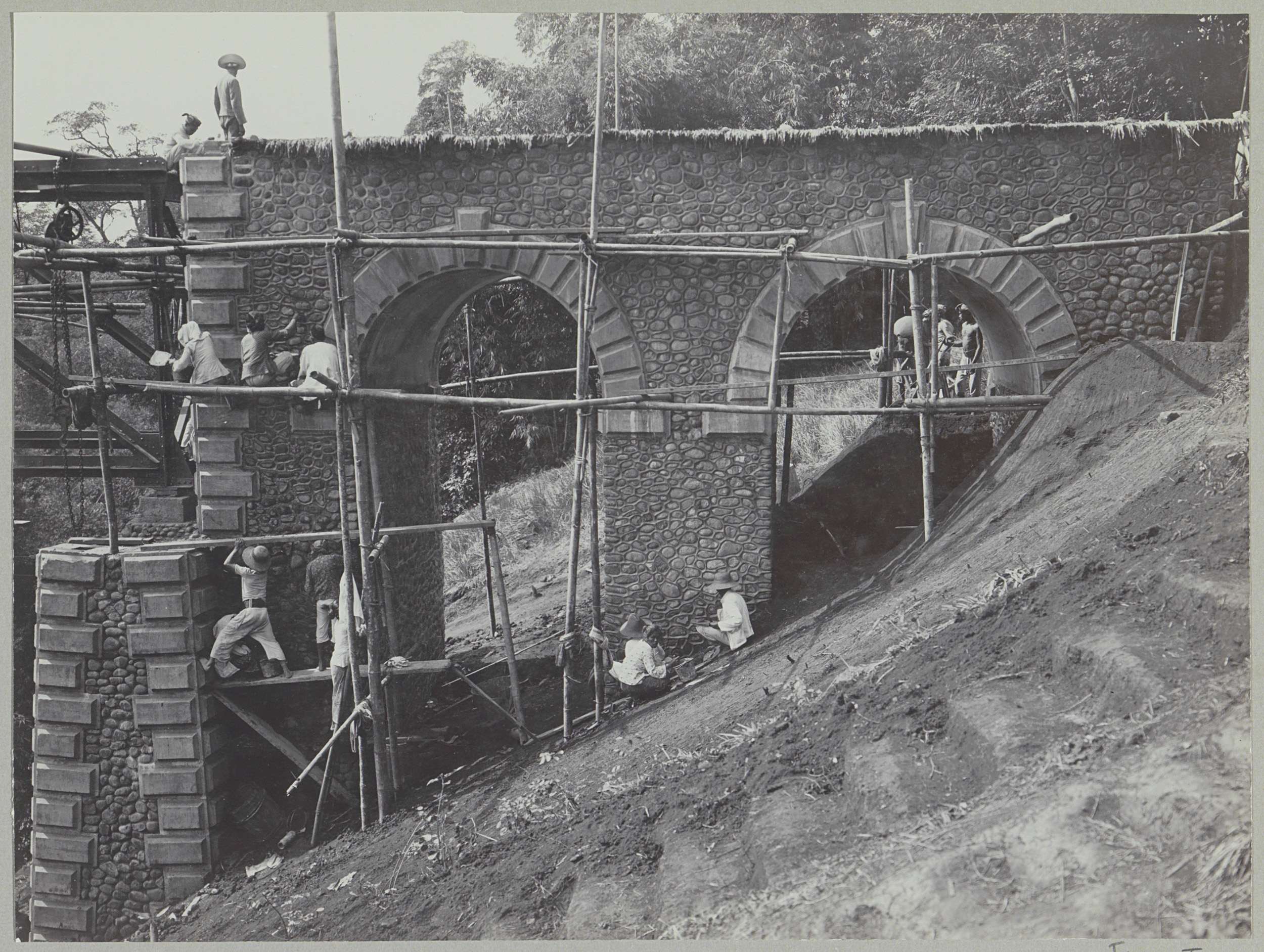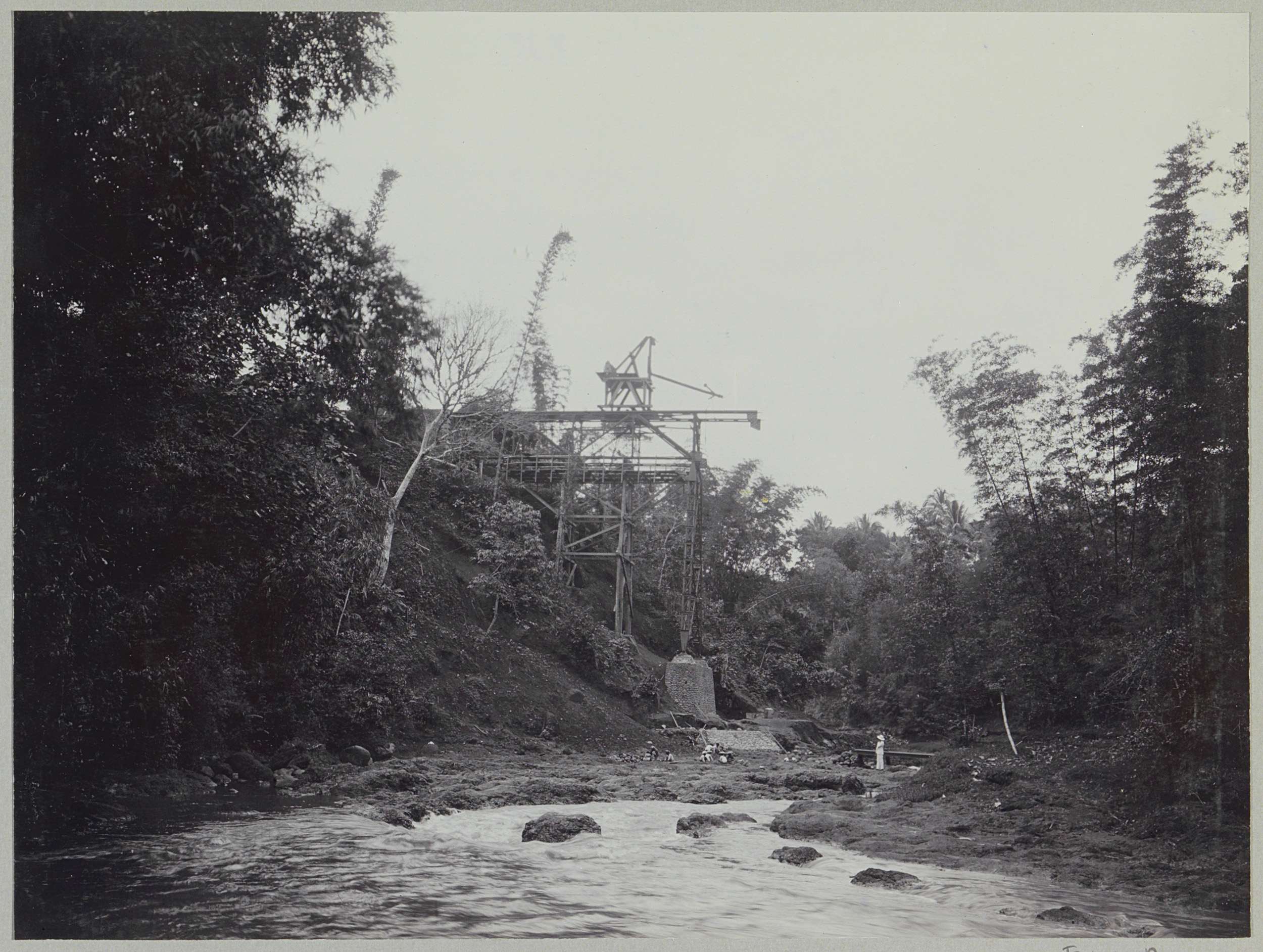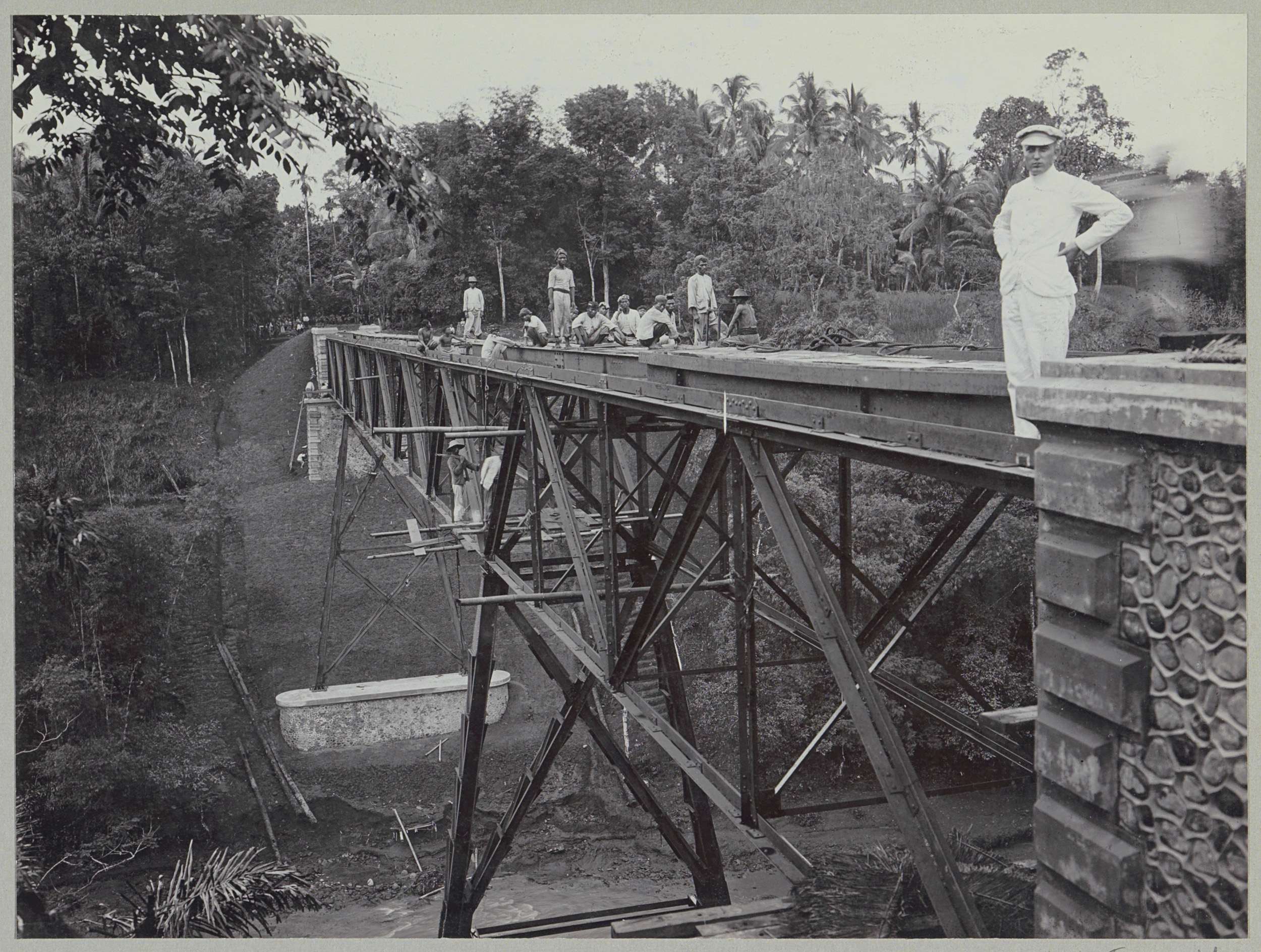 Javaanse arbeiders op een afgebouwde brug over de Ka...