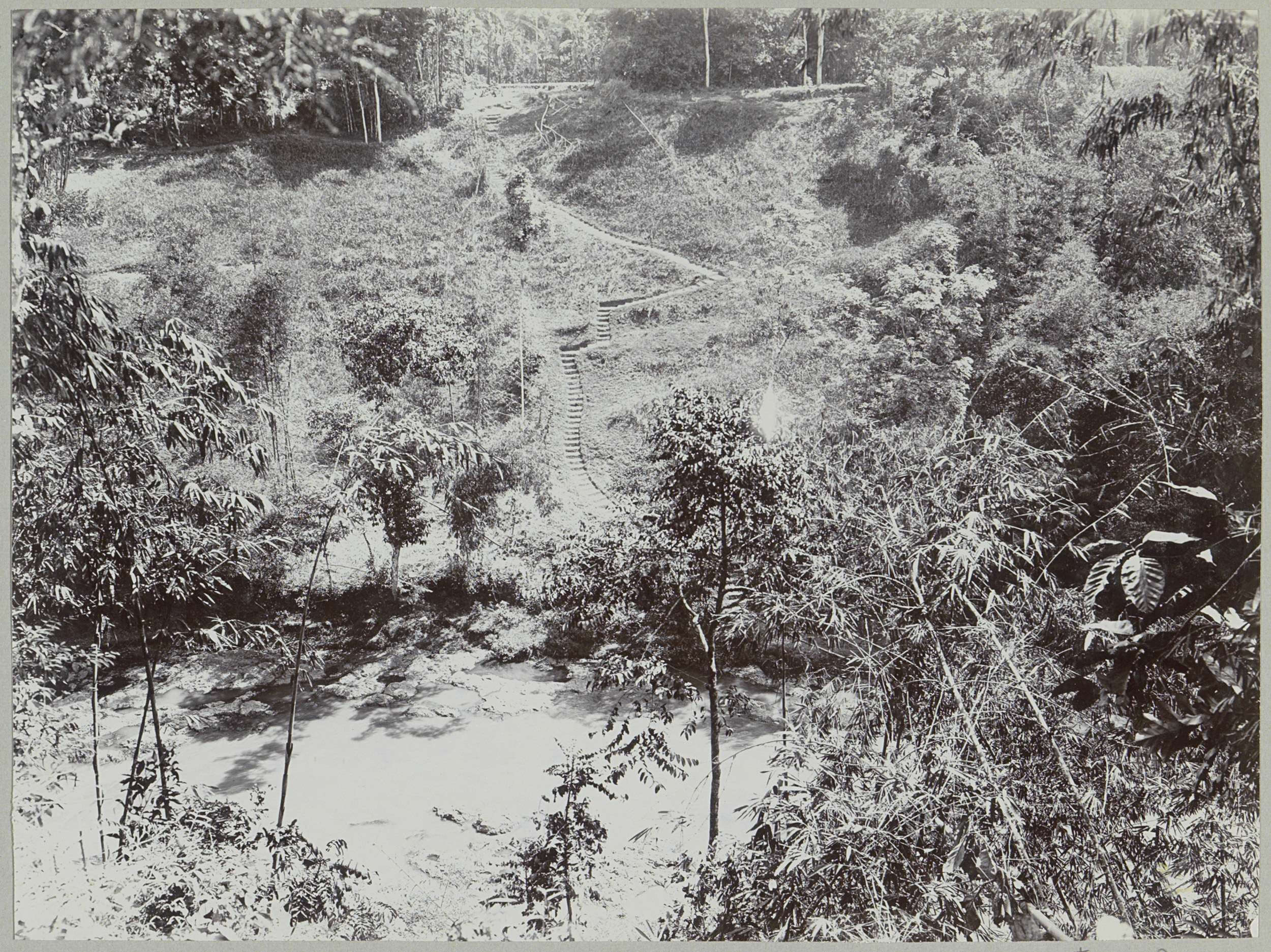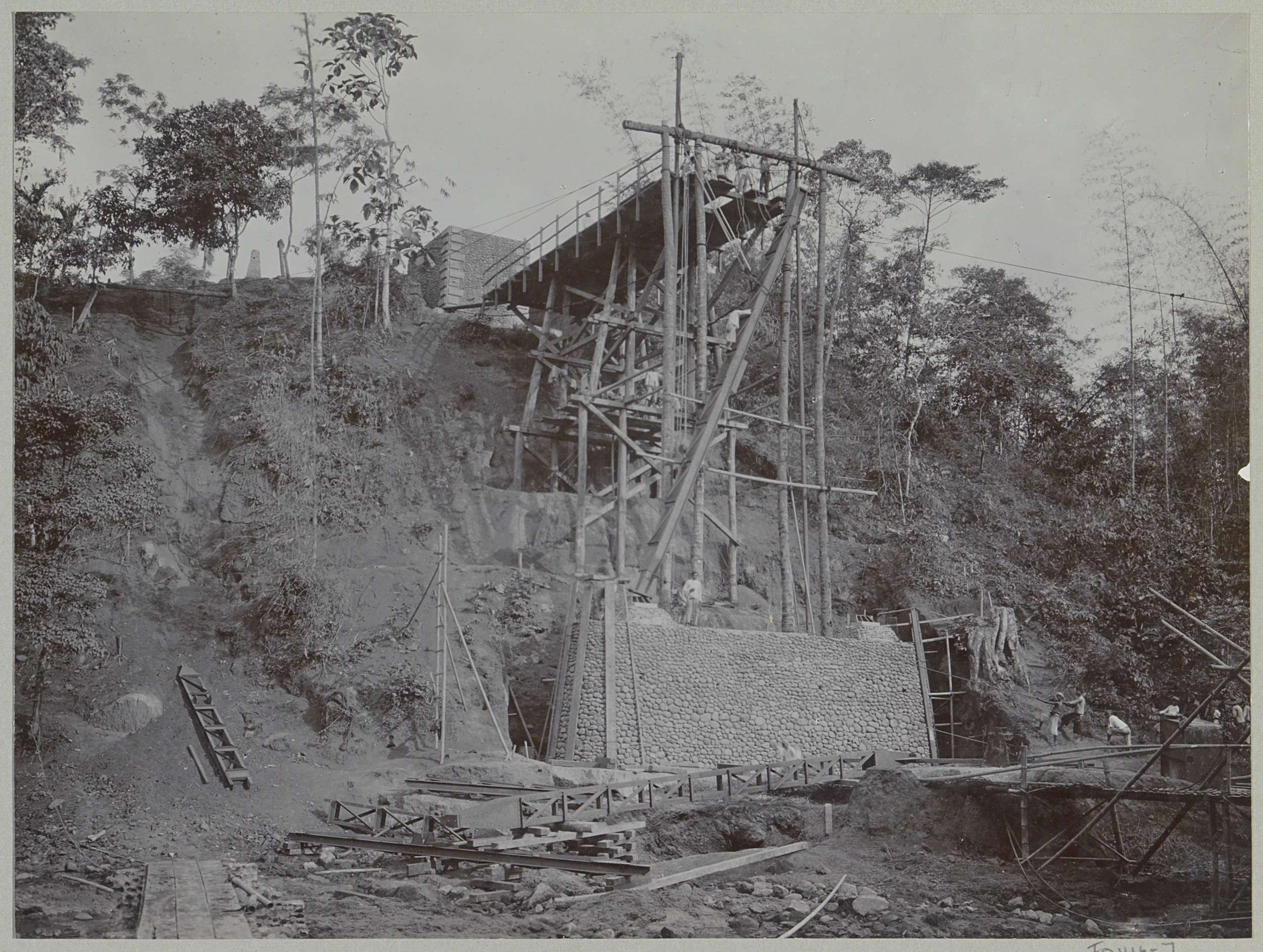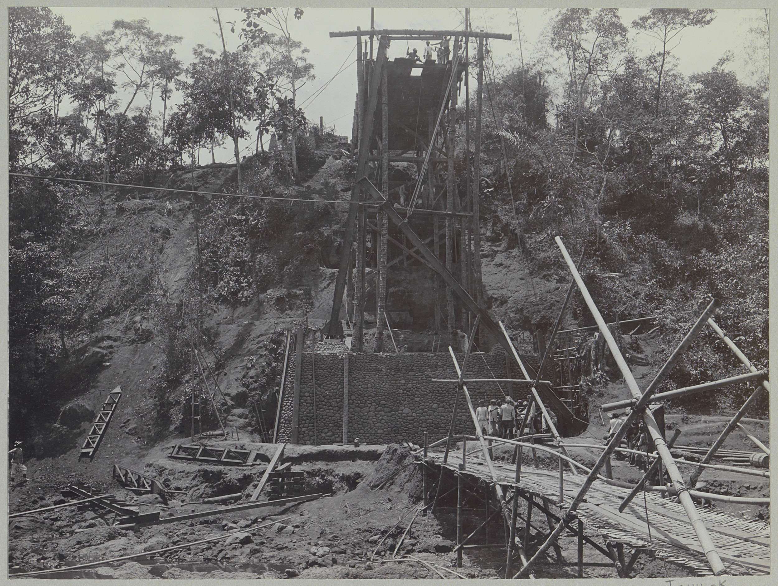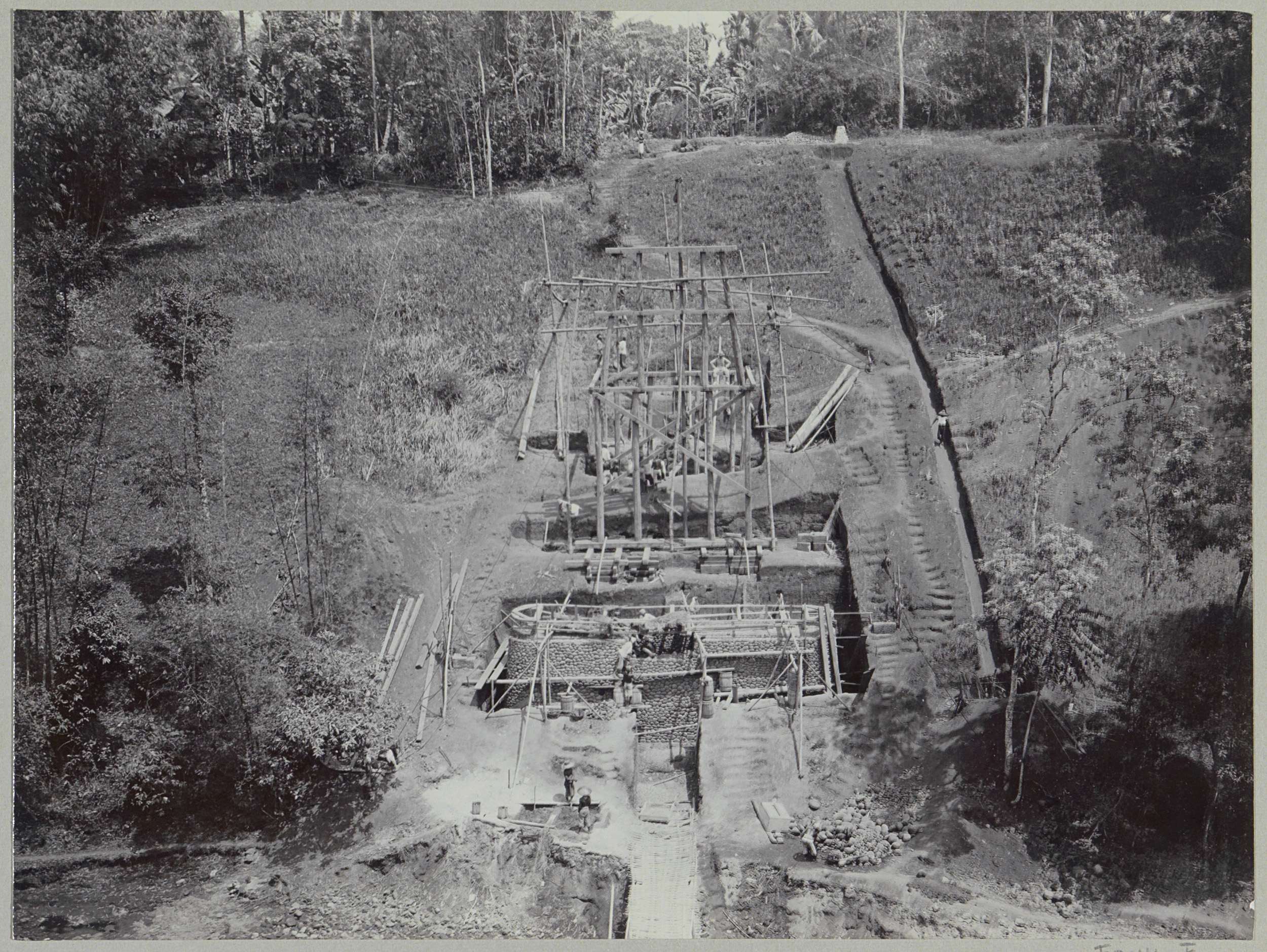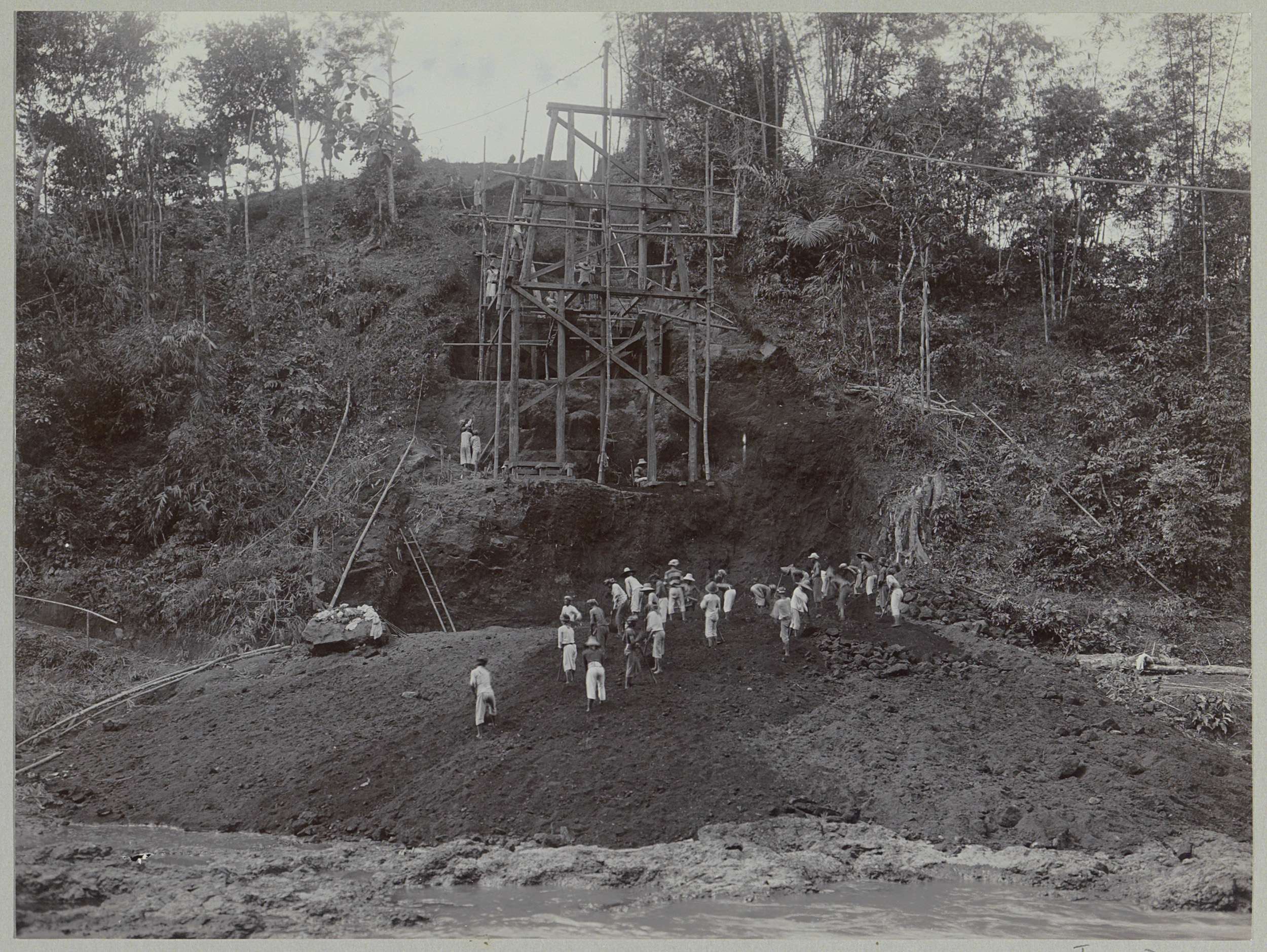 Javaanse arbeiders op een afgebouwde brug over de Ka...