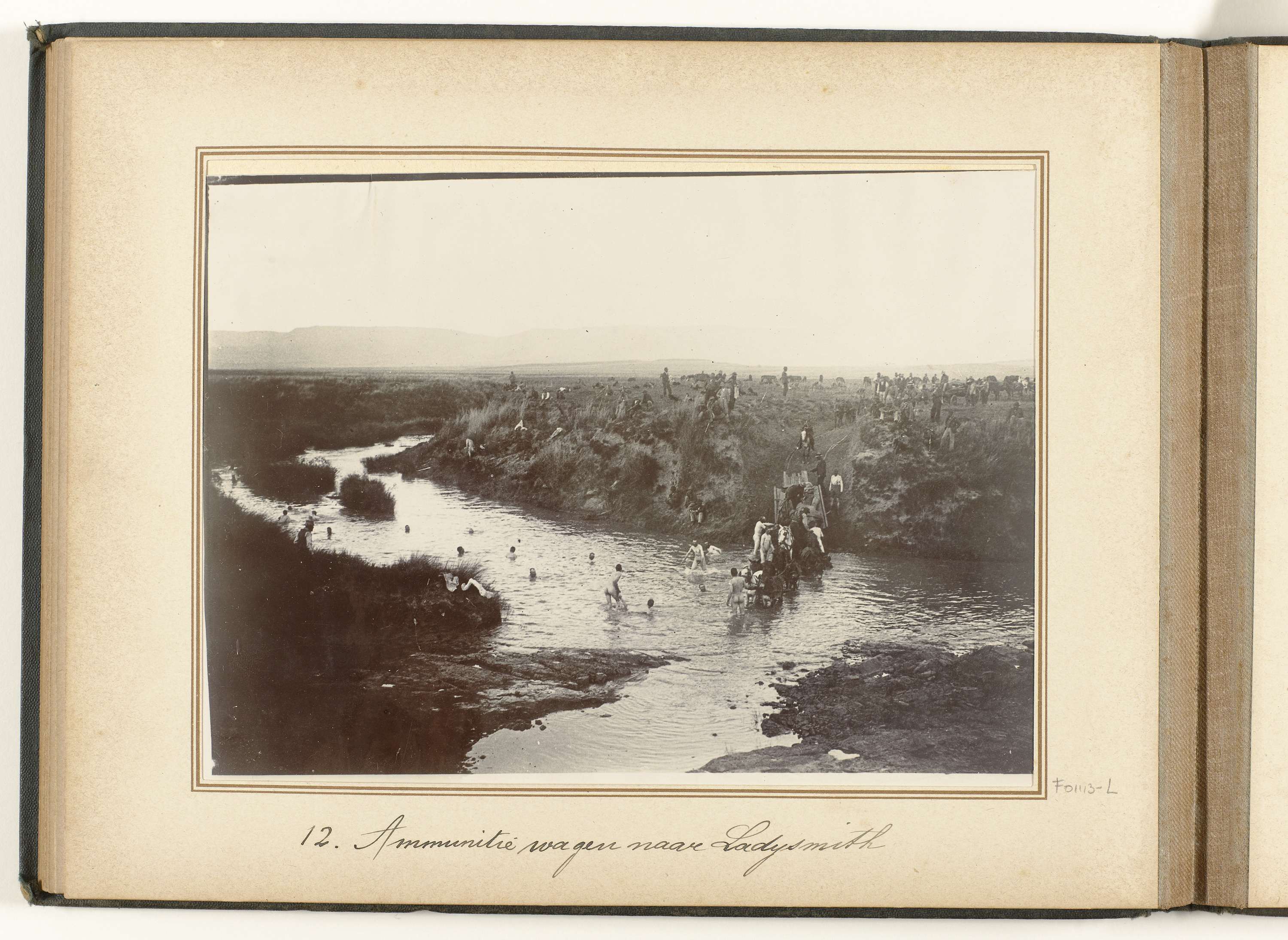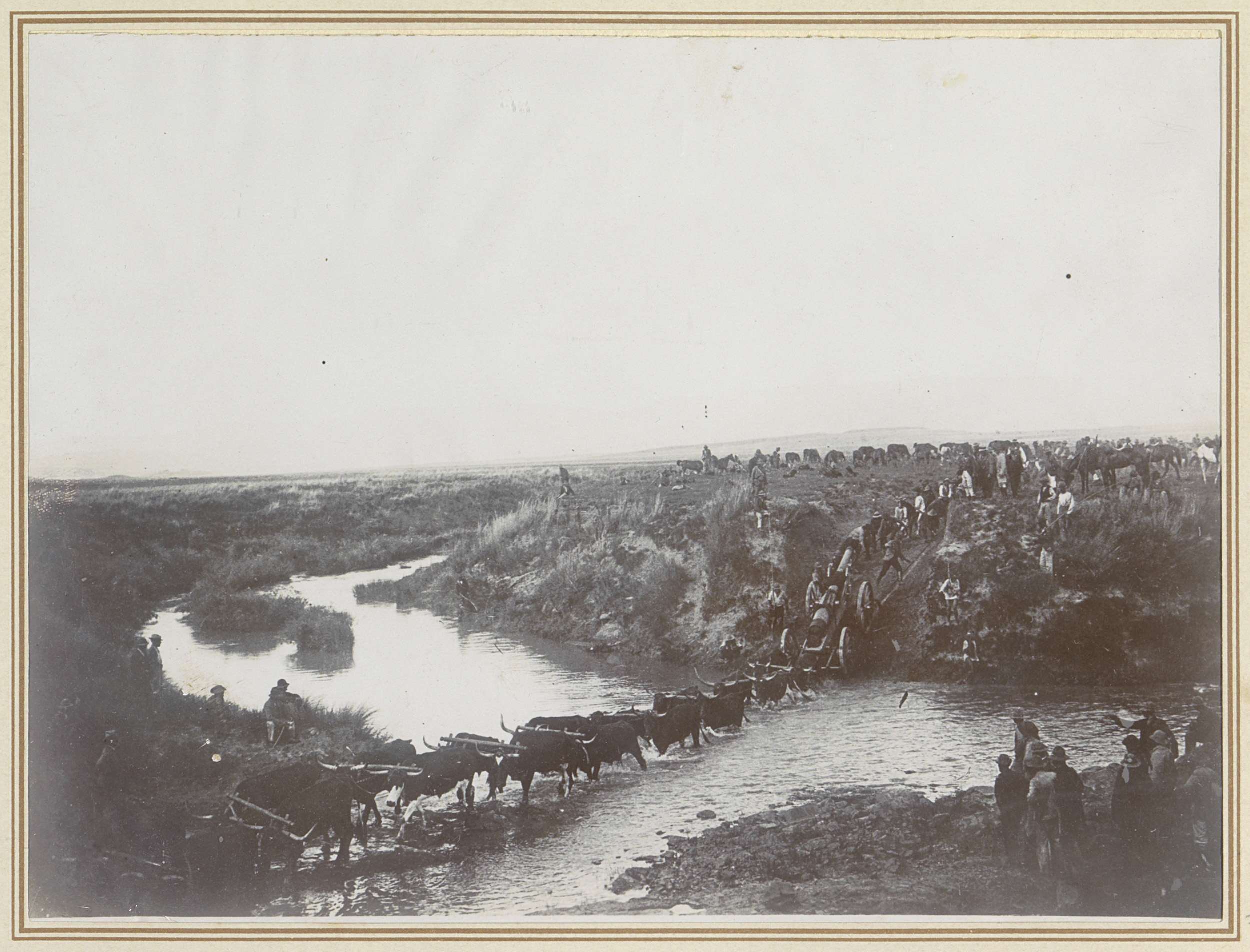 Ossen trekken ammunitiewagen over de Kliprivier in Z...