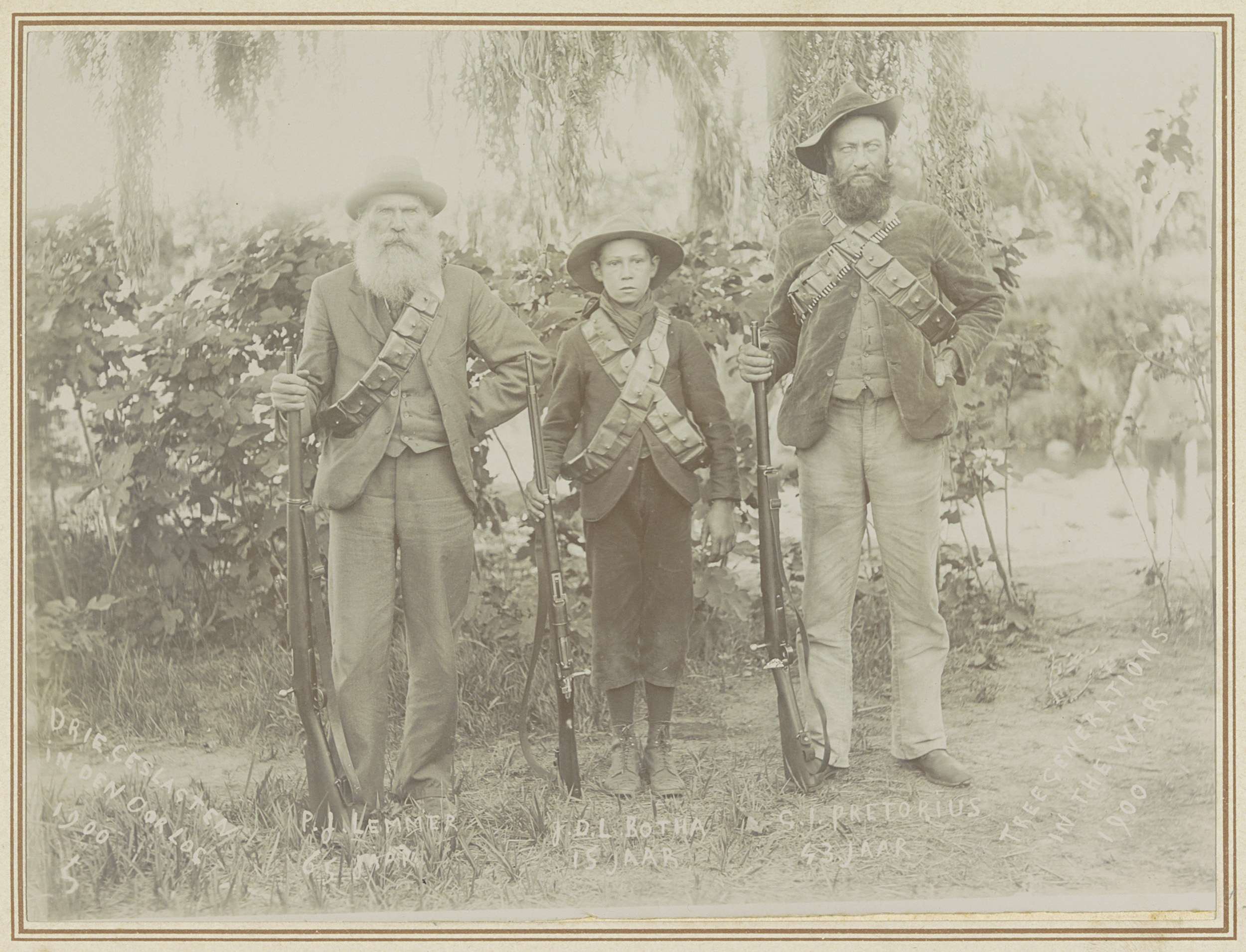 Groepsportret van drie deelnemers aan de Tweede Boer...
