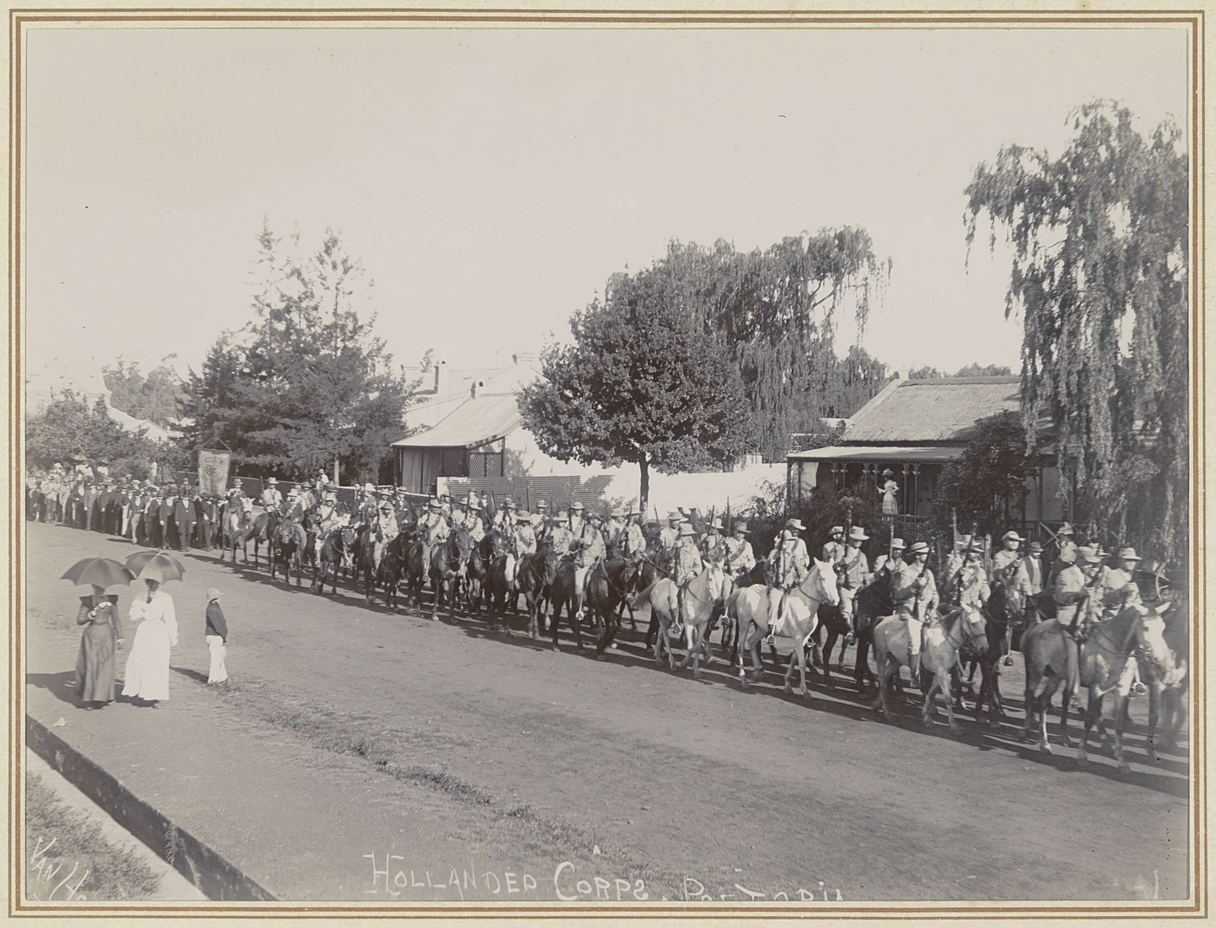 Optocht van een Hollands legerkorps in een straat in...