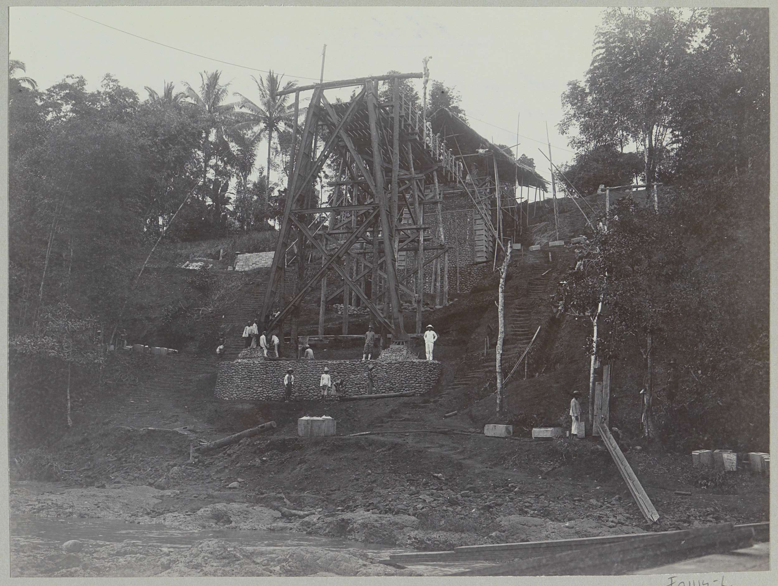 Bouw van een houten stelling op de oostelijke oever ...