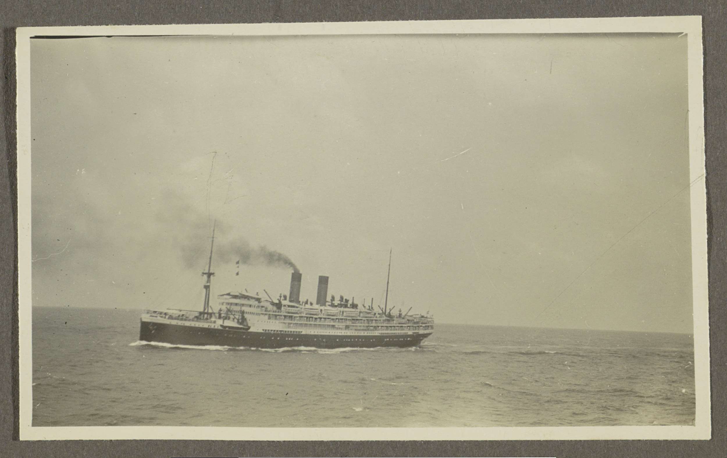 Passagiersschip met een rokende schoorsteen op zee