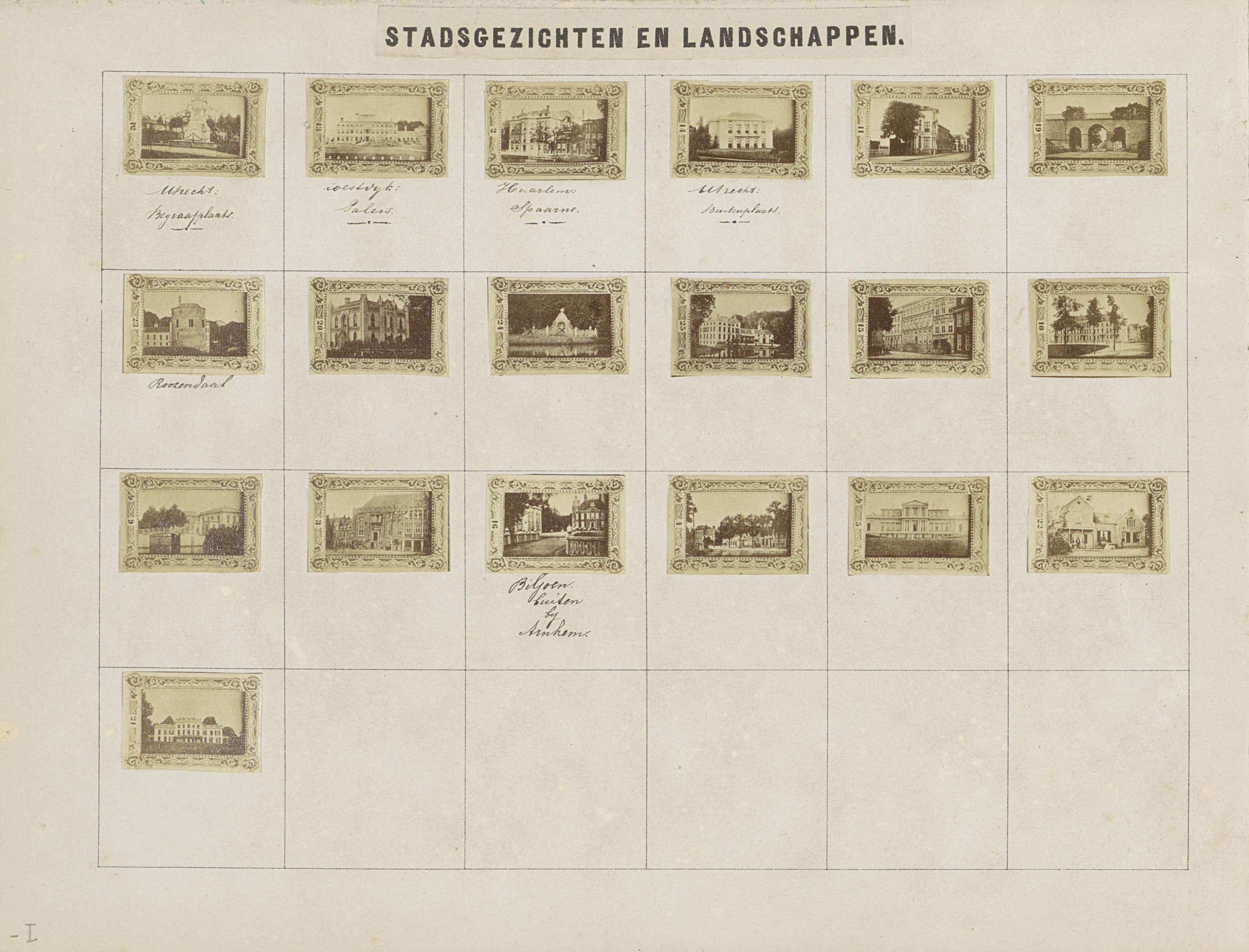 Albumblad met namen en afbeeldingen van gebouwen in ...