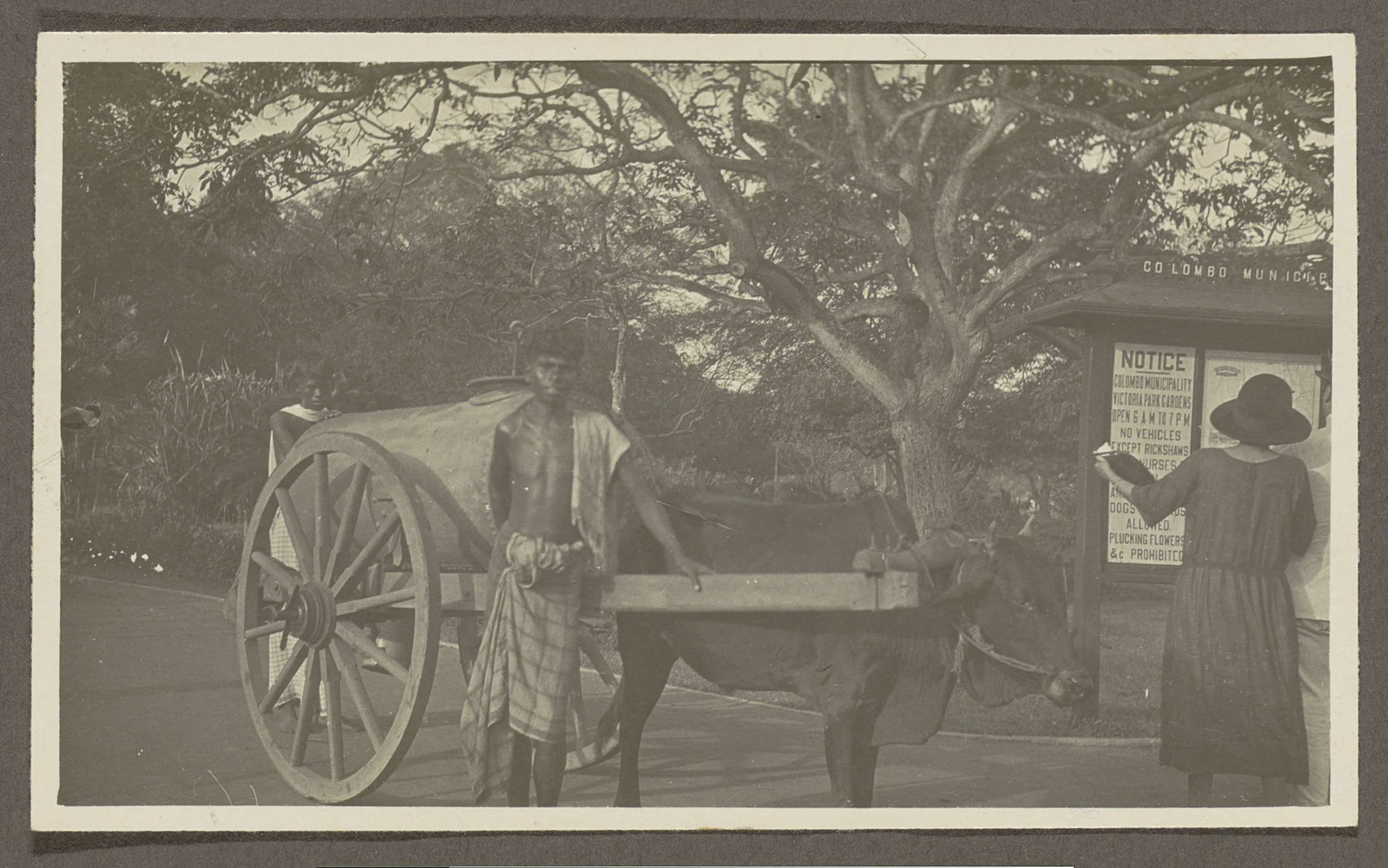Twee jongens met een ossenwagen, rechts een vrouw