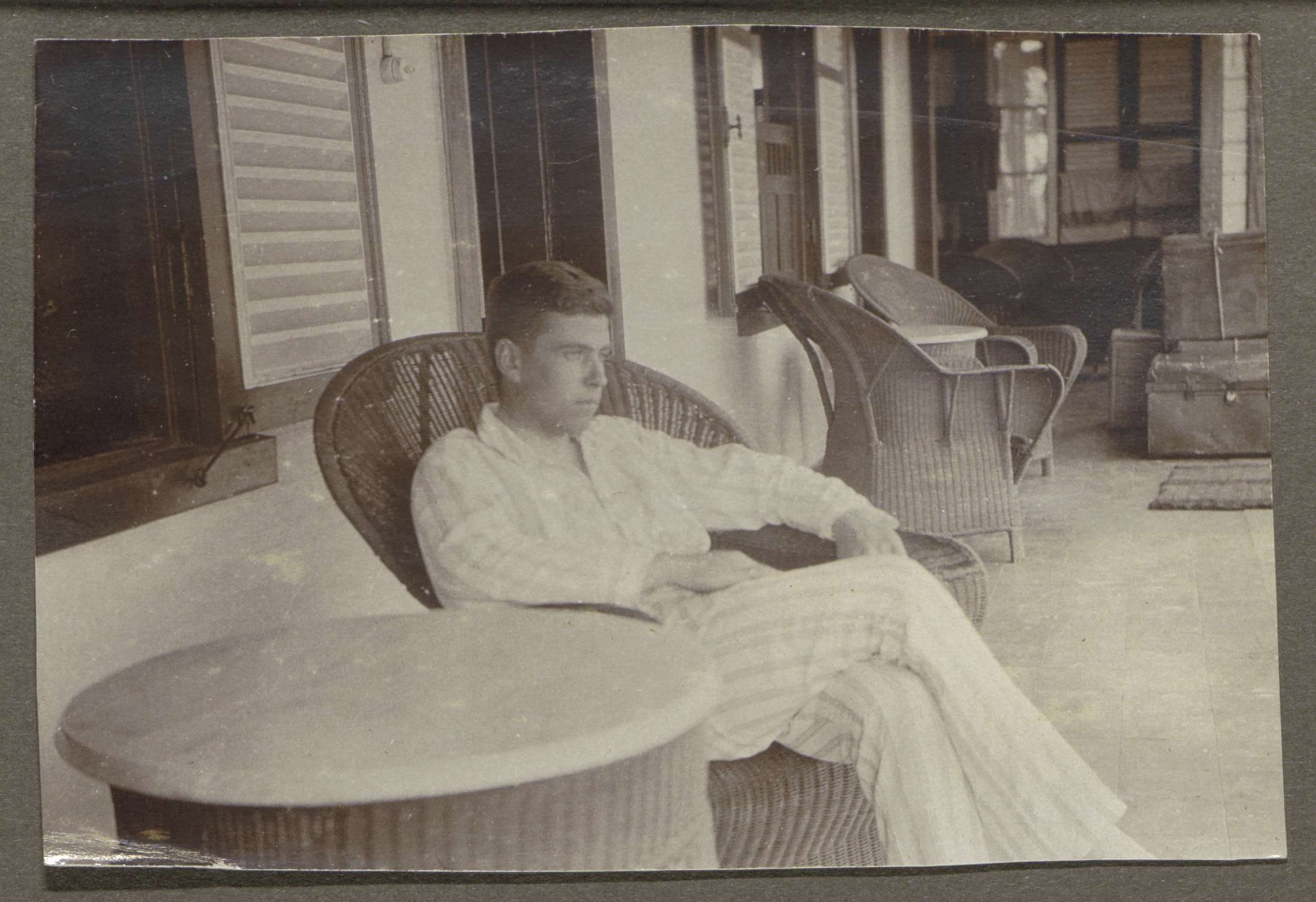 Man in een pyjama zittend in een rieten stoel op een...