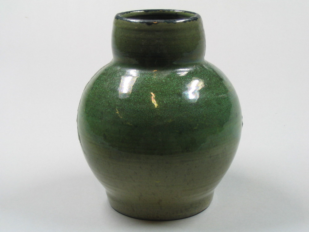 vaas van keramiek, mosgroen van kleur, met roodroze ...