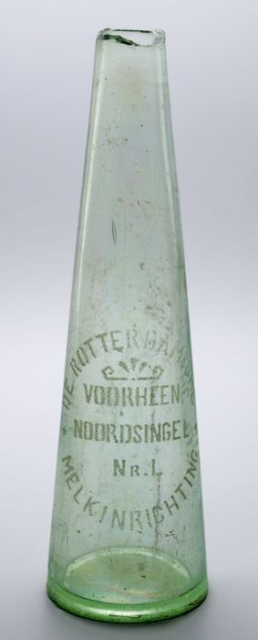 Conische melkfles met geëtst opschrift "DE ROTTERDAM...
