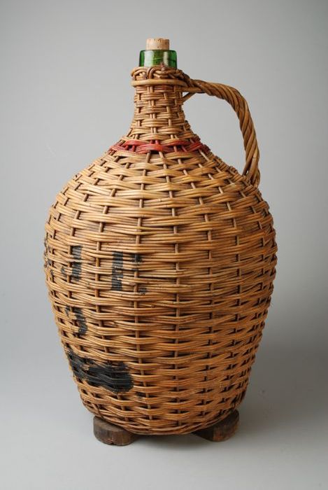 Mandfles "R.J.P. 9" met aan de mand bevestigde houte...