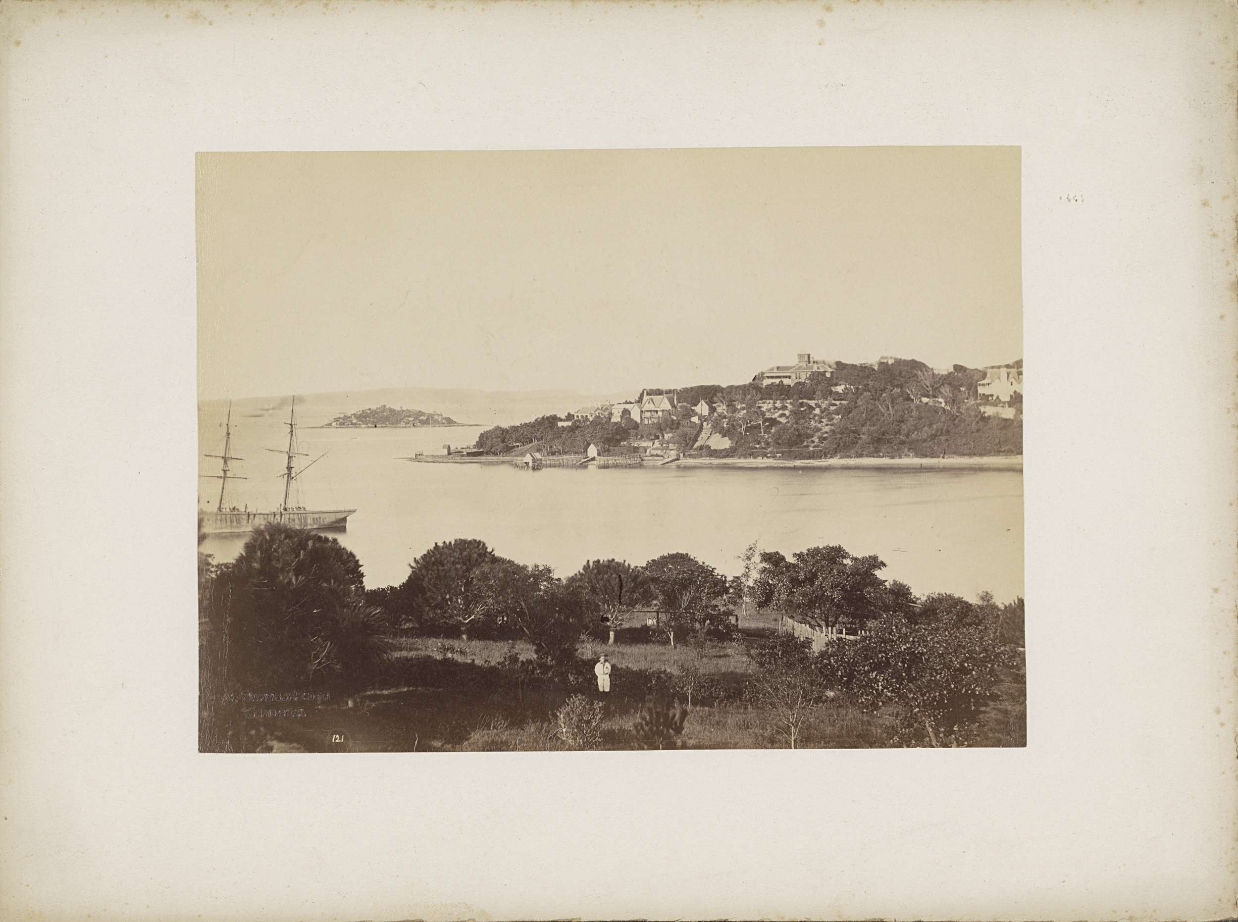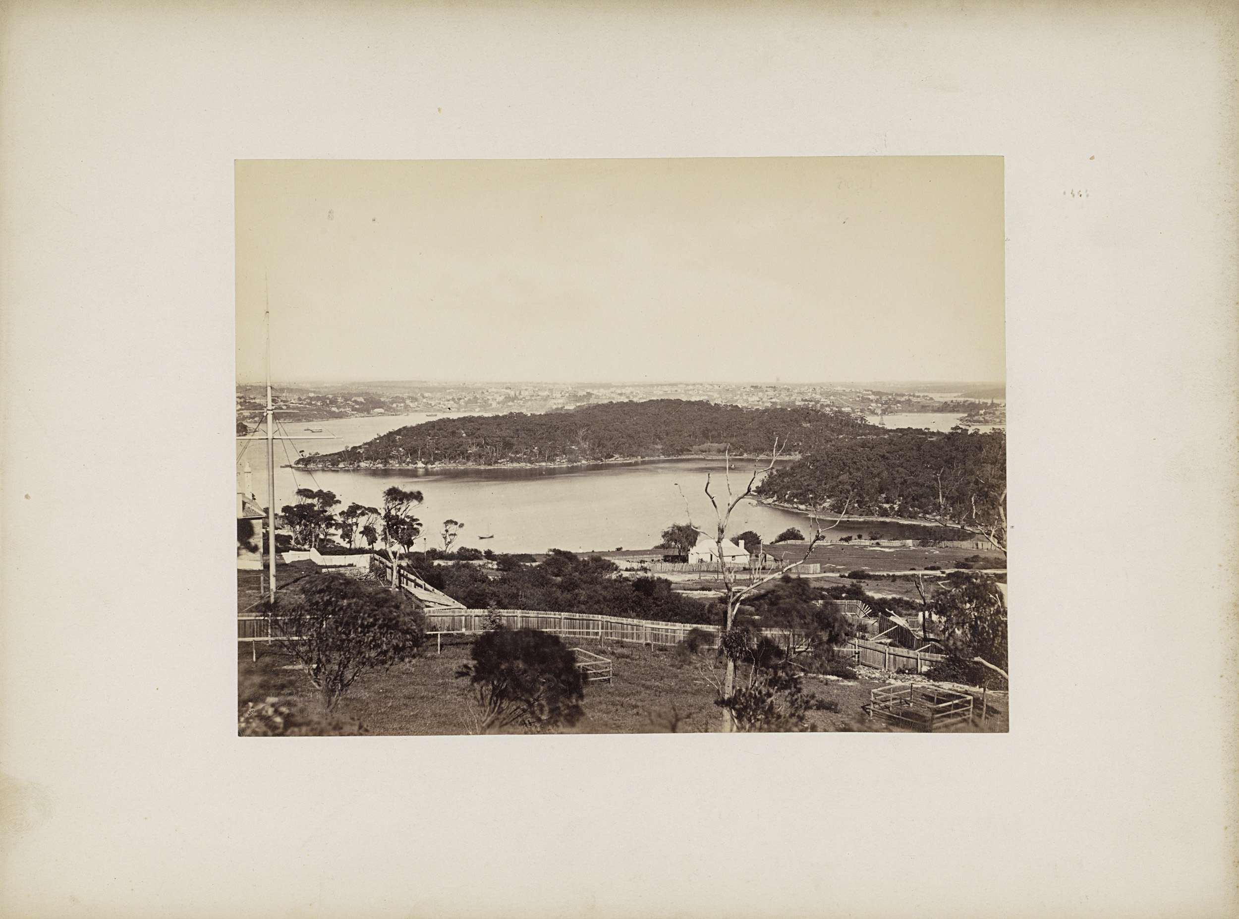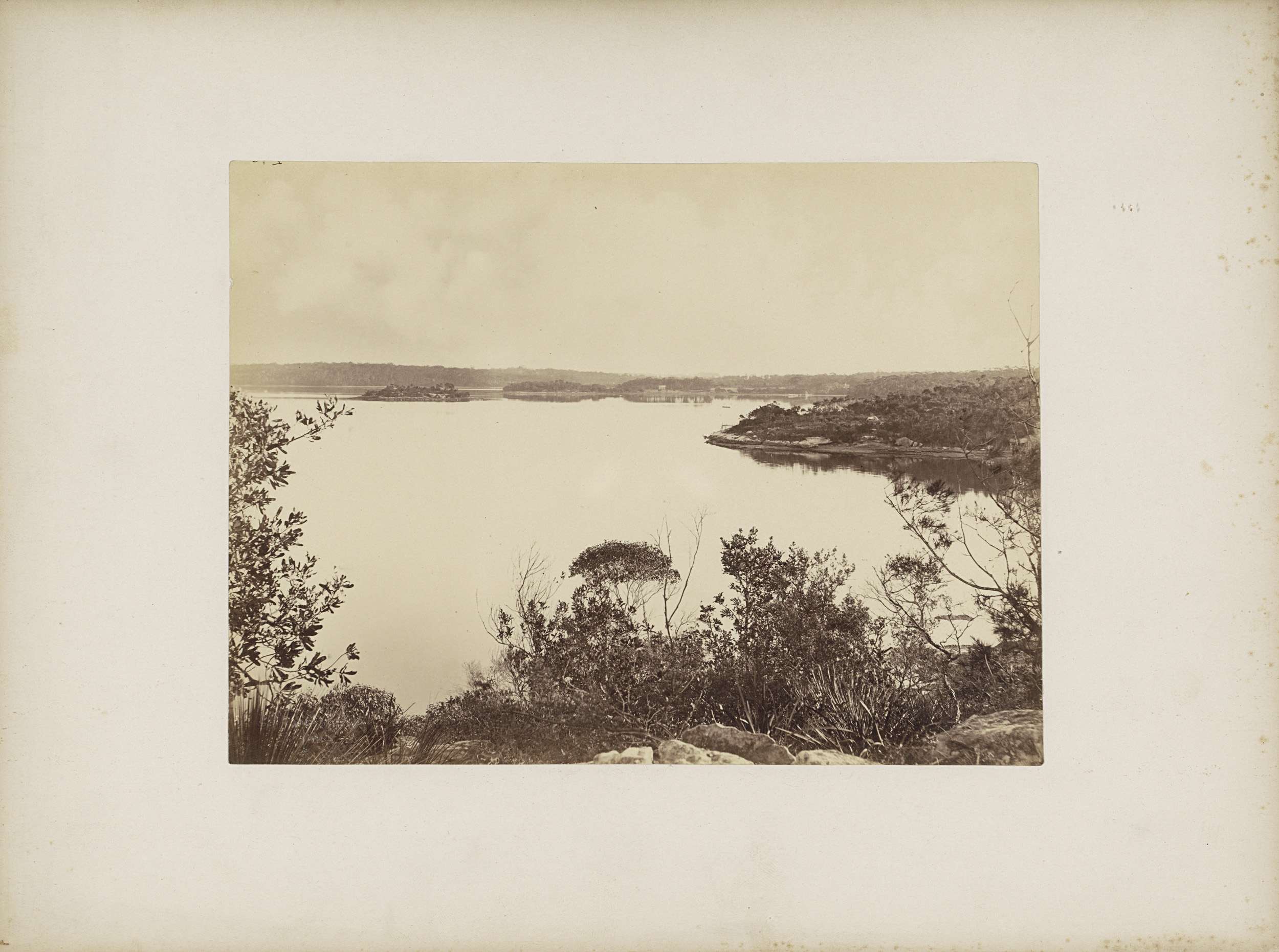Gezicht op een baai en oevers van (vermoedelijk) Sydney
