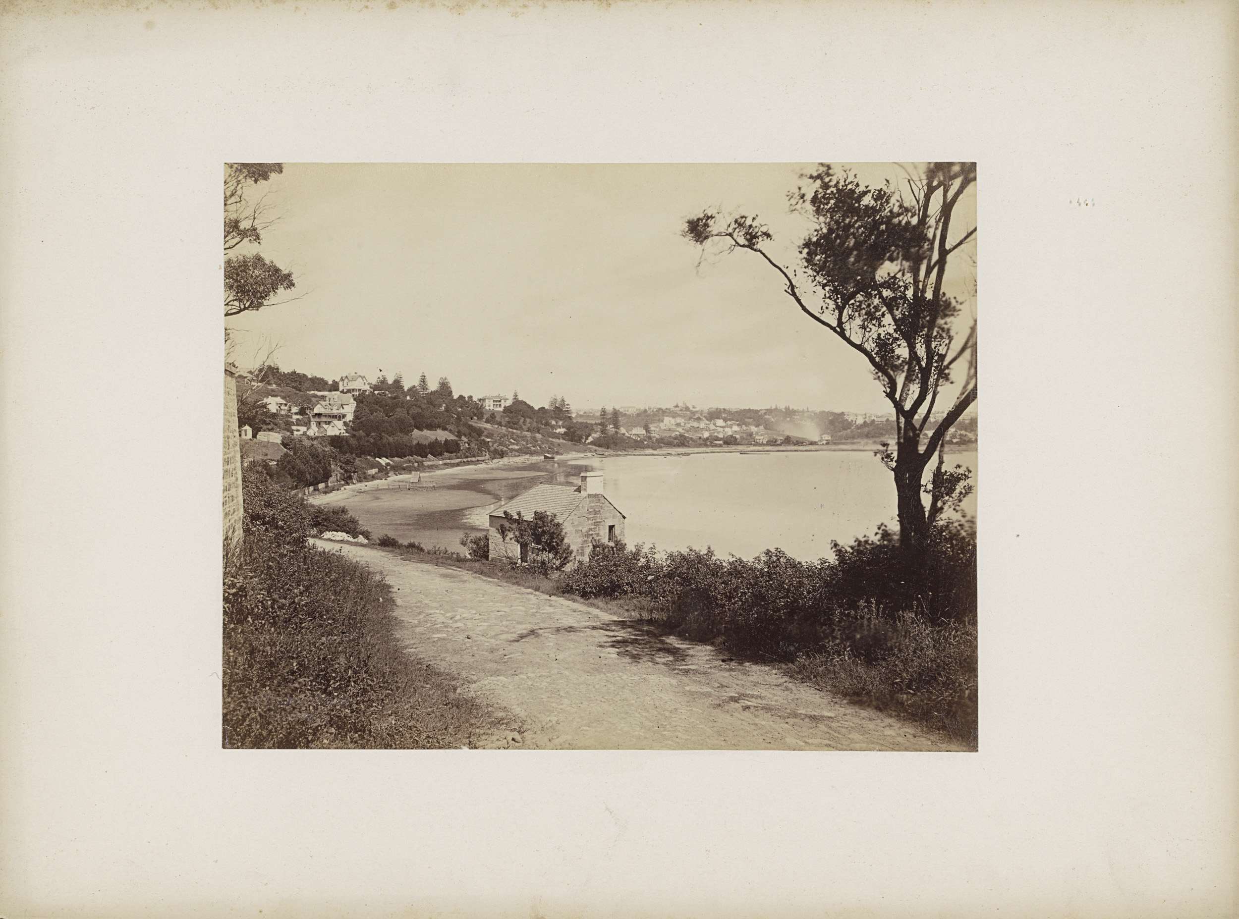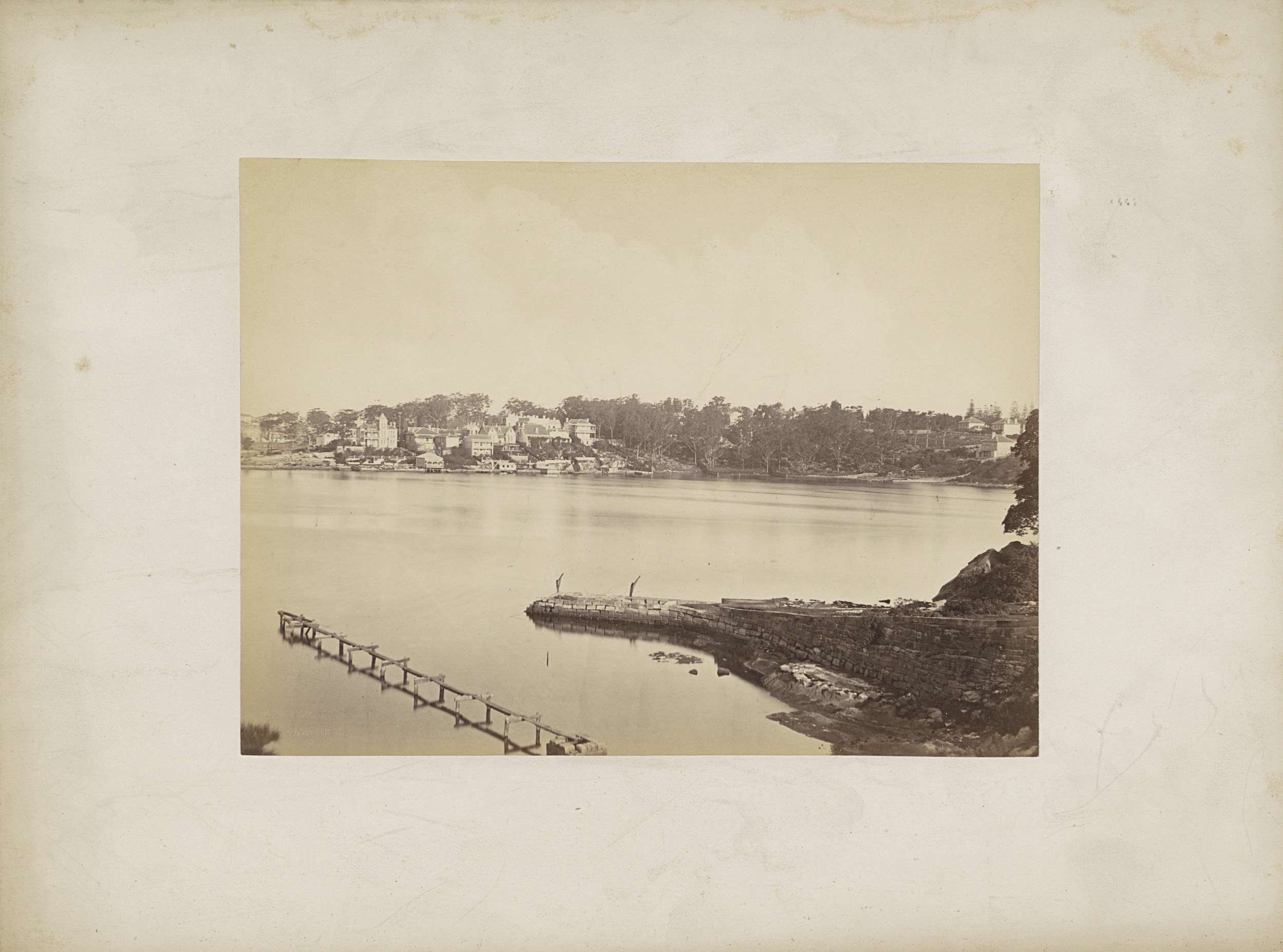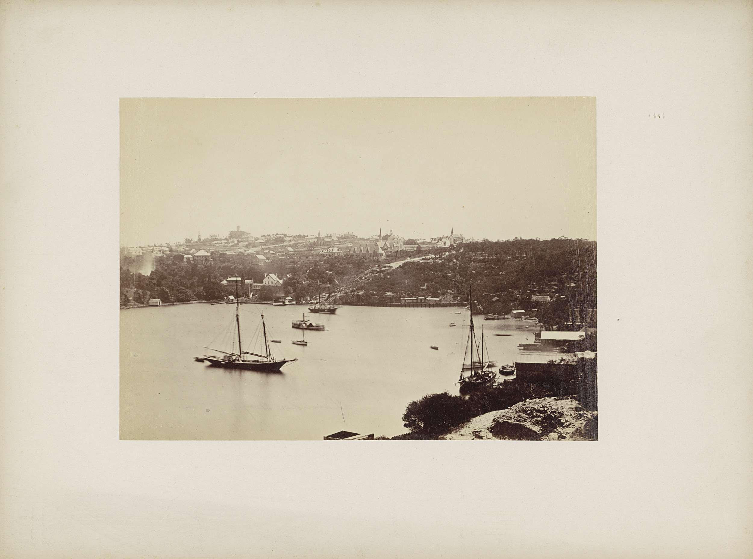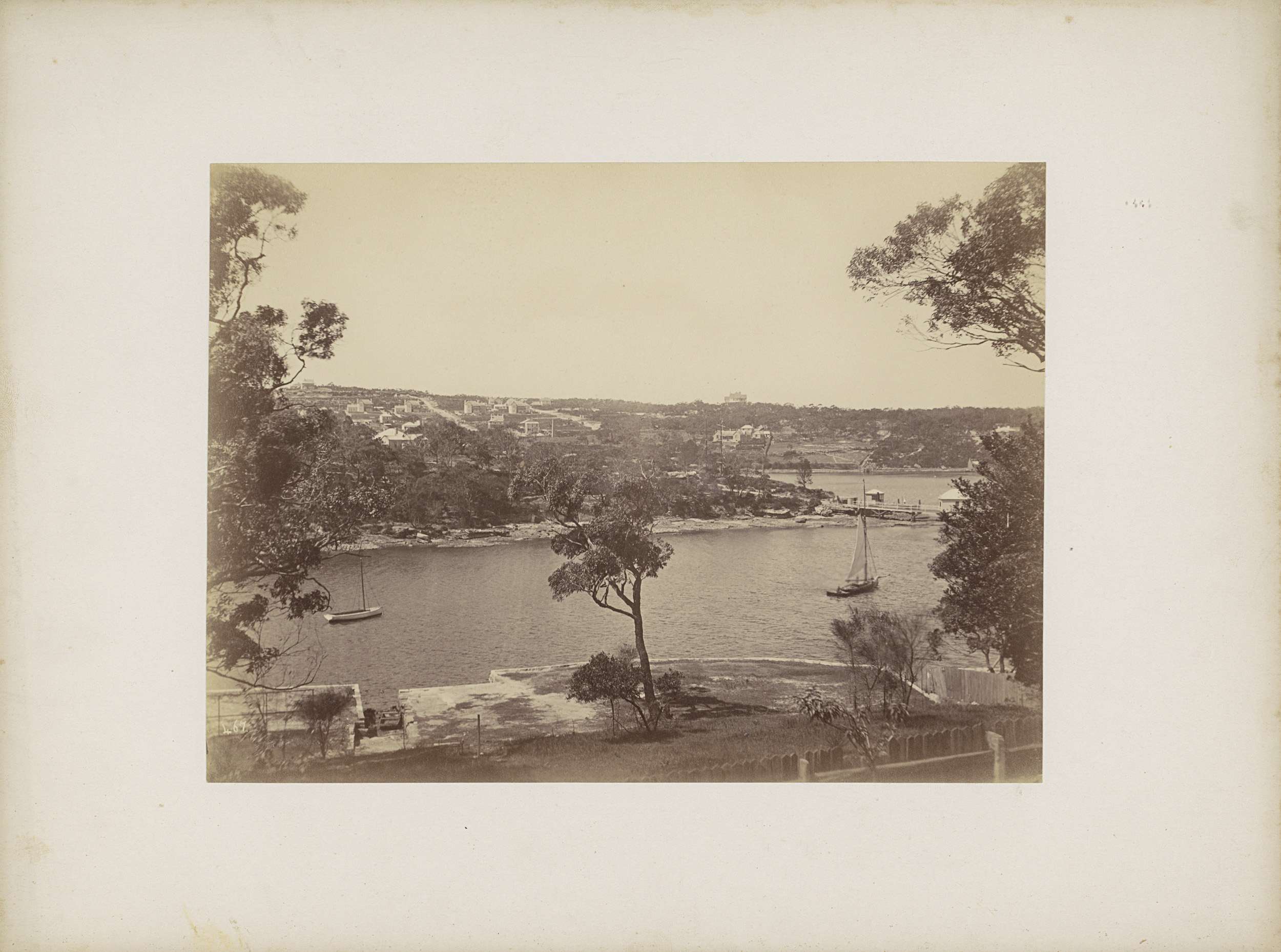 Gezicht op een baai en oevers van (vermoedelijk) Sydney