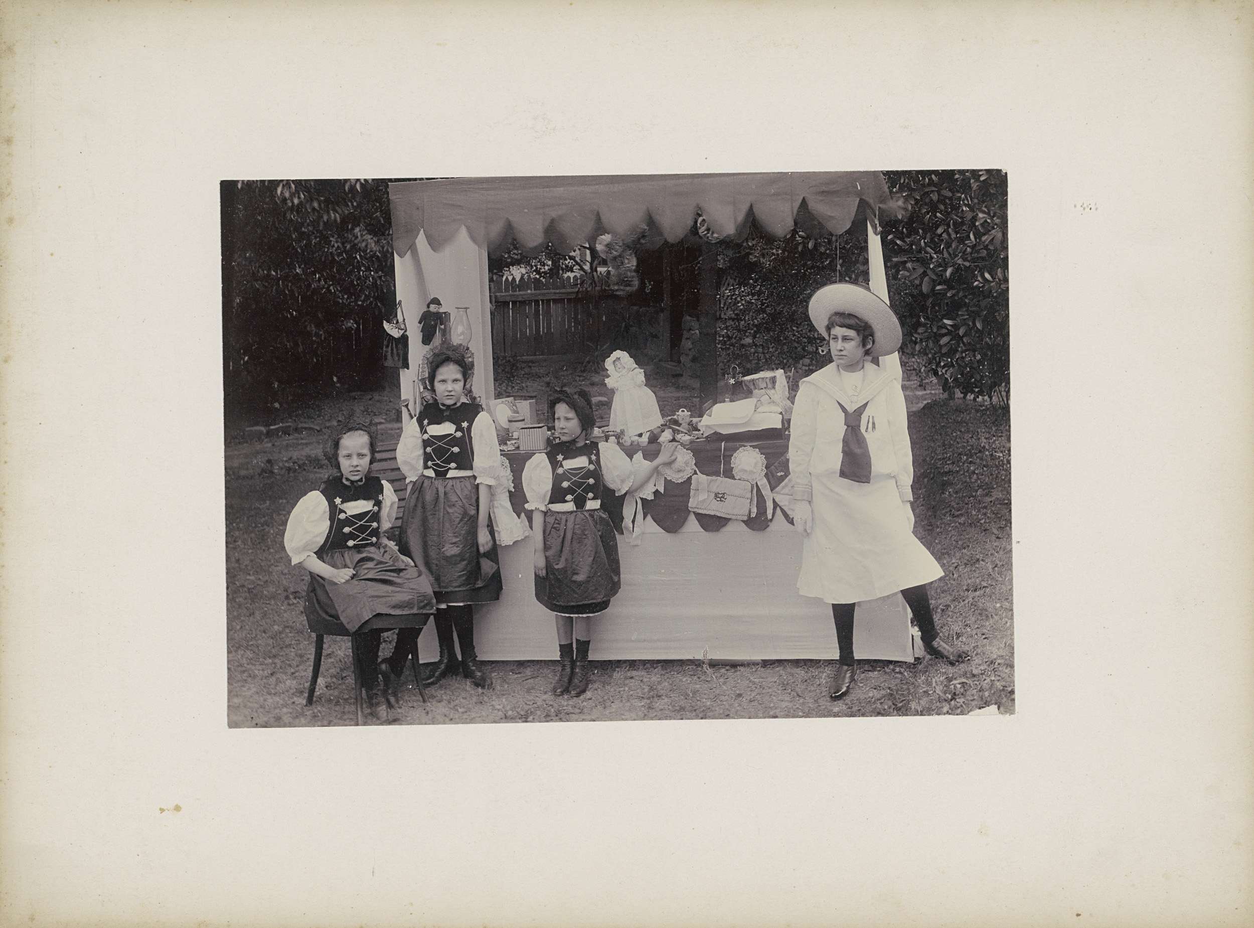 Groepsportret van kinderen in kostuum bij een kraam ...