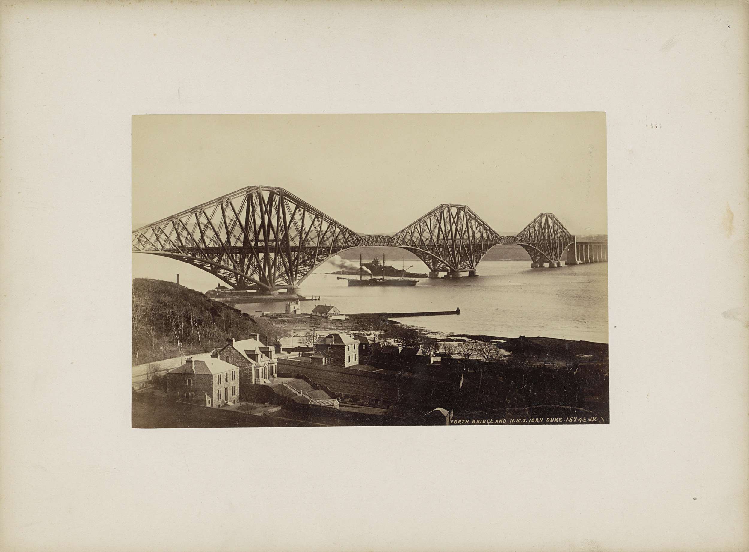 Gezicht op de Forth Bridge over de Firth of Forth in...