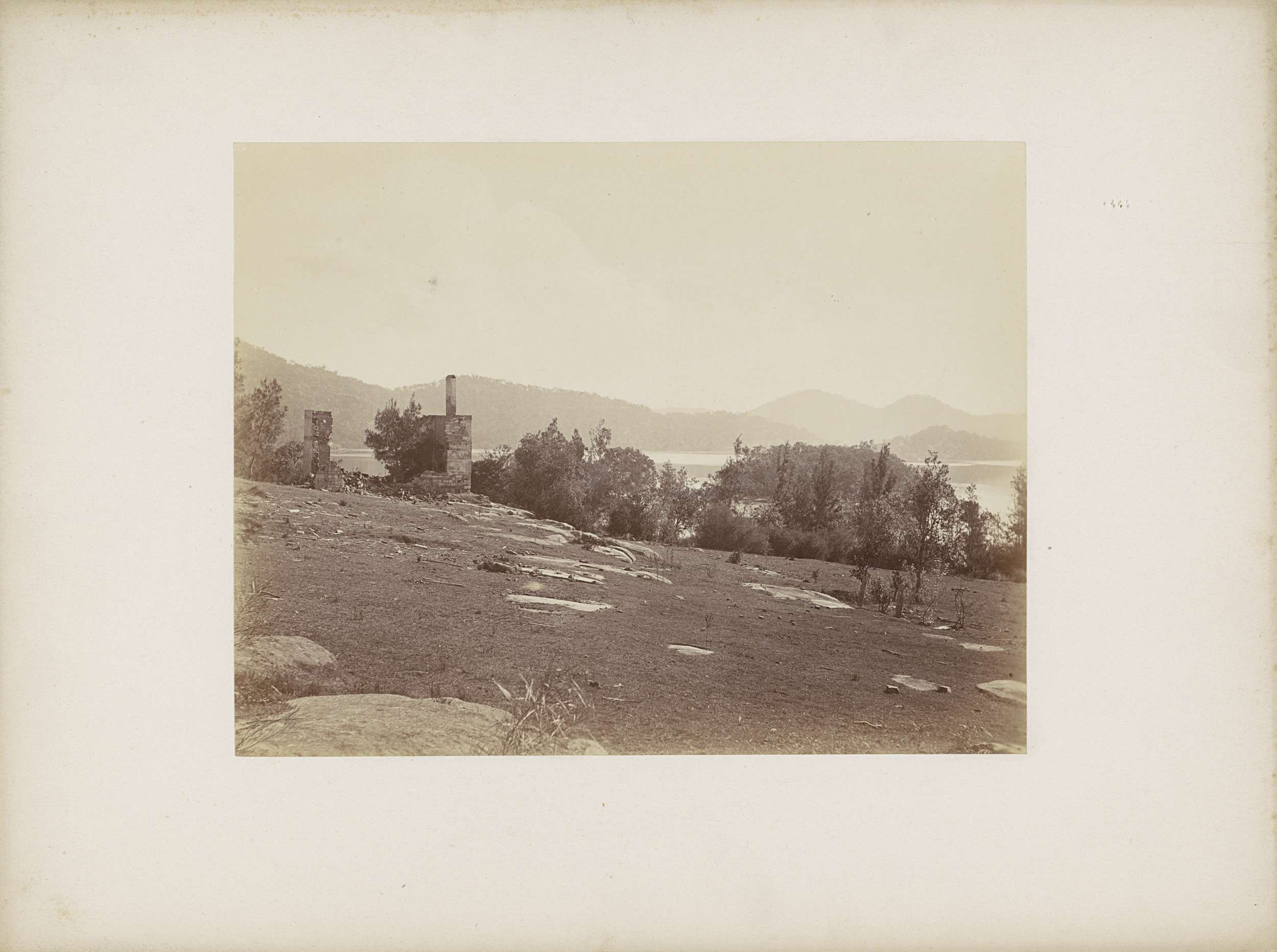 Gezicht op een baai met beboste oevers, vermoedelijk...