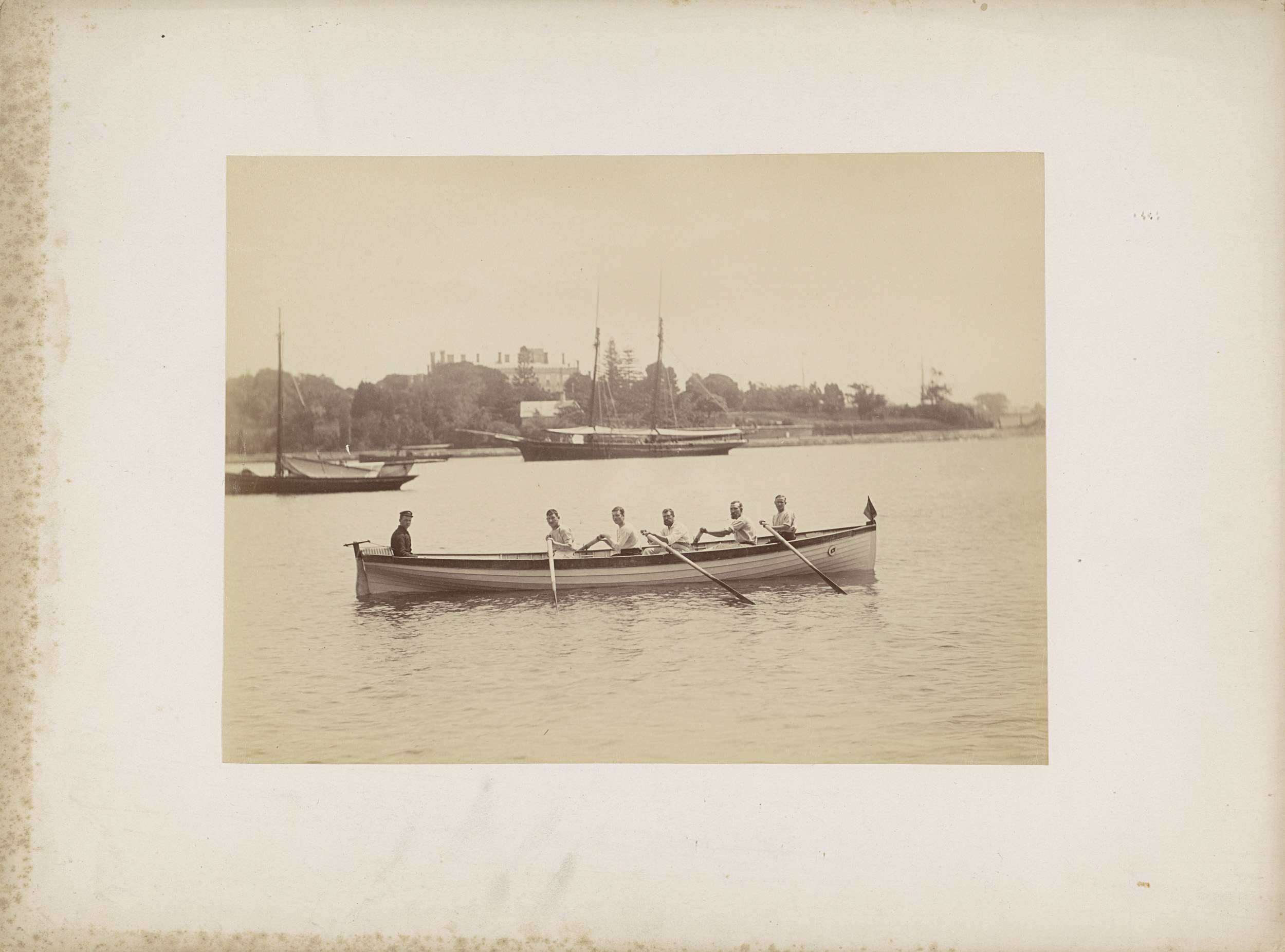 Zes mannen in een roeiboot langs de kust, vermoedeli...