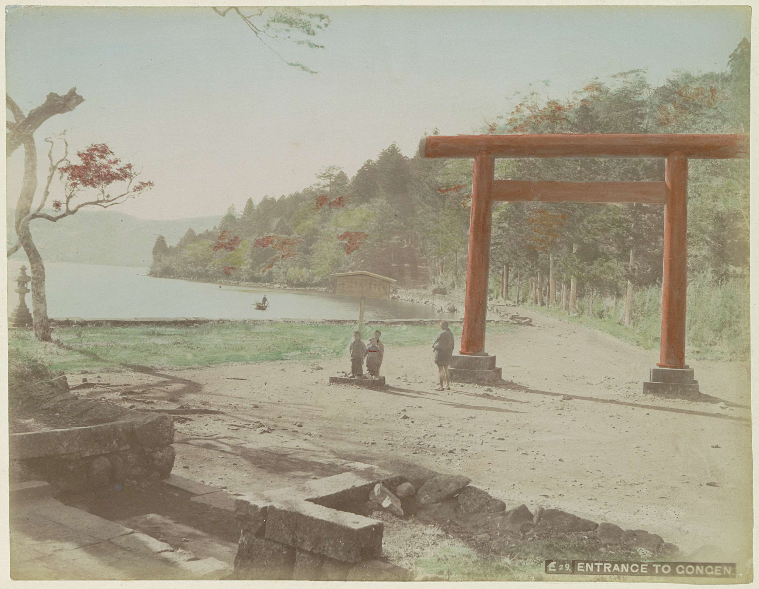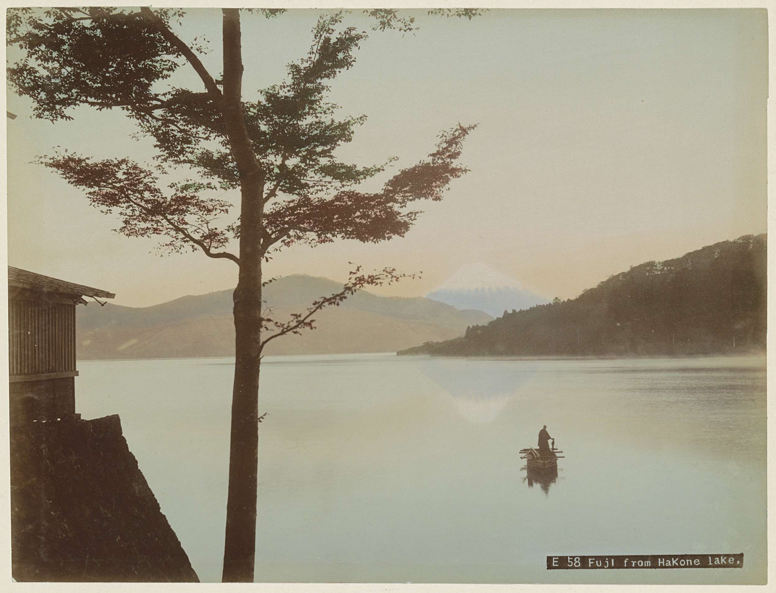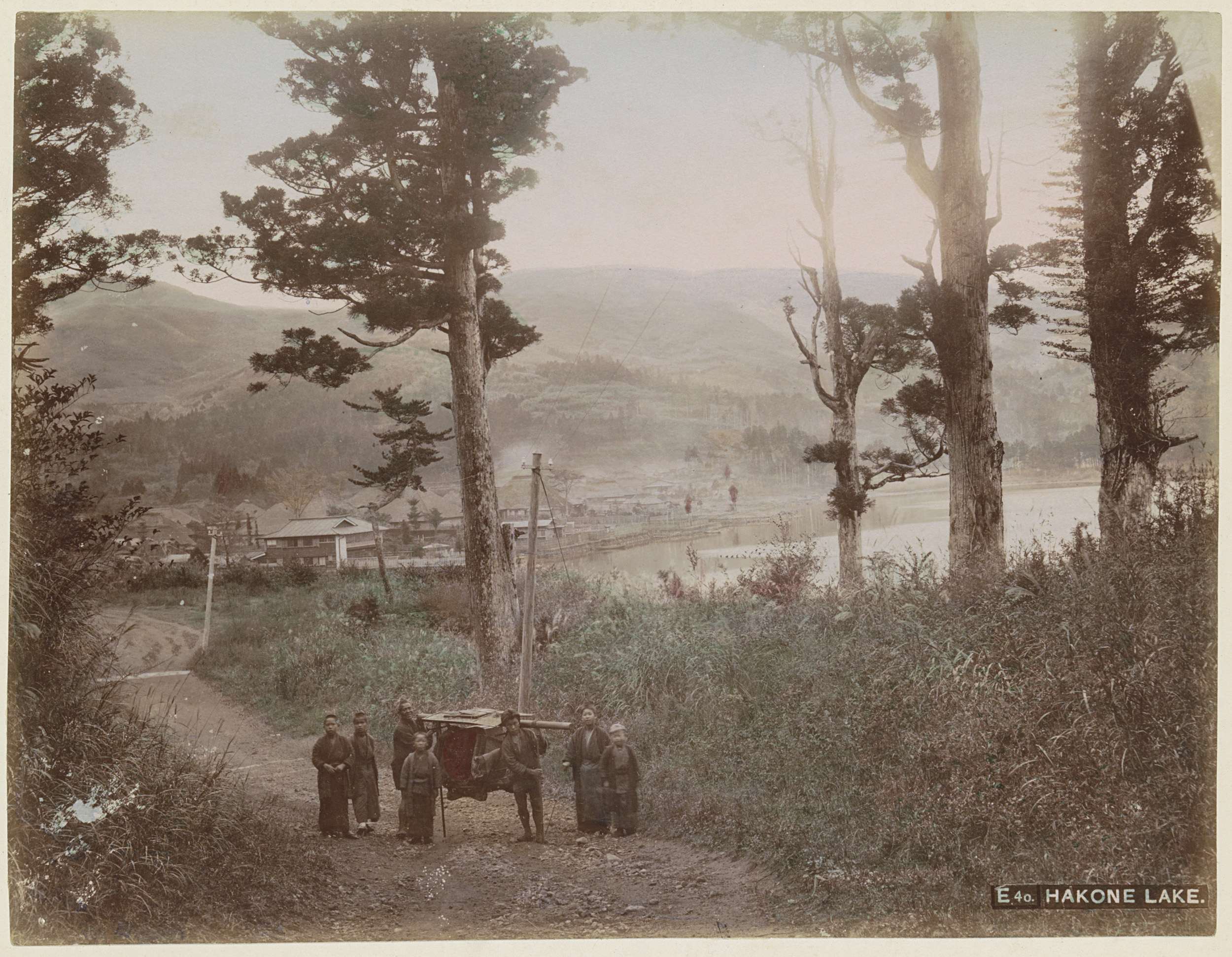 Gezicht op het meer van Hakone met op de voorgrond k...