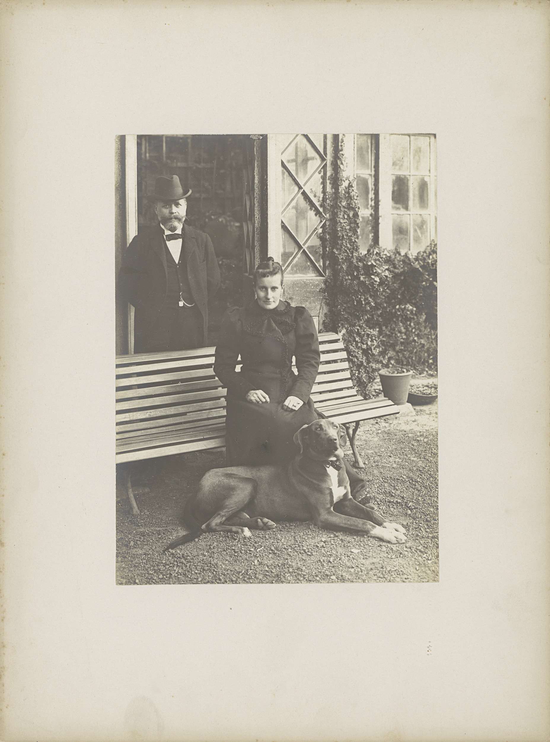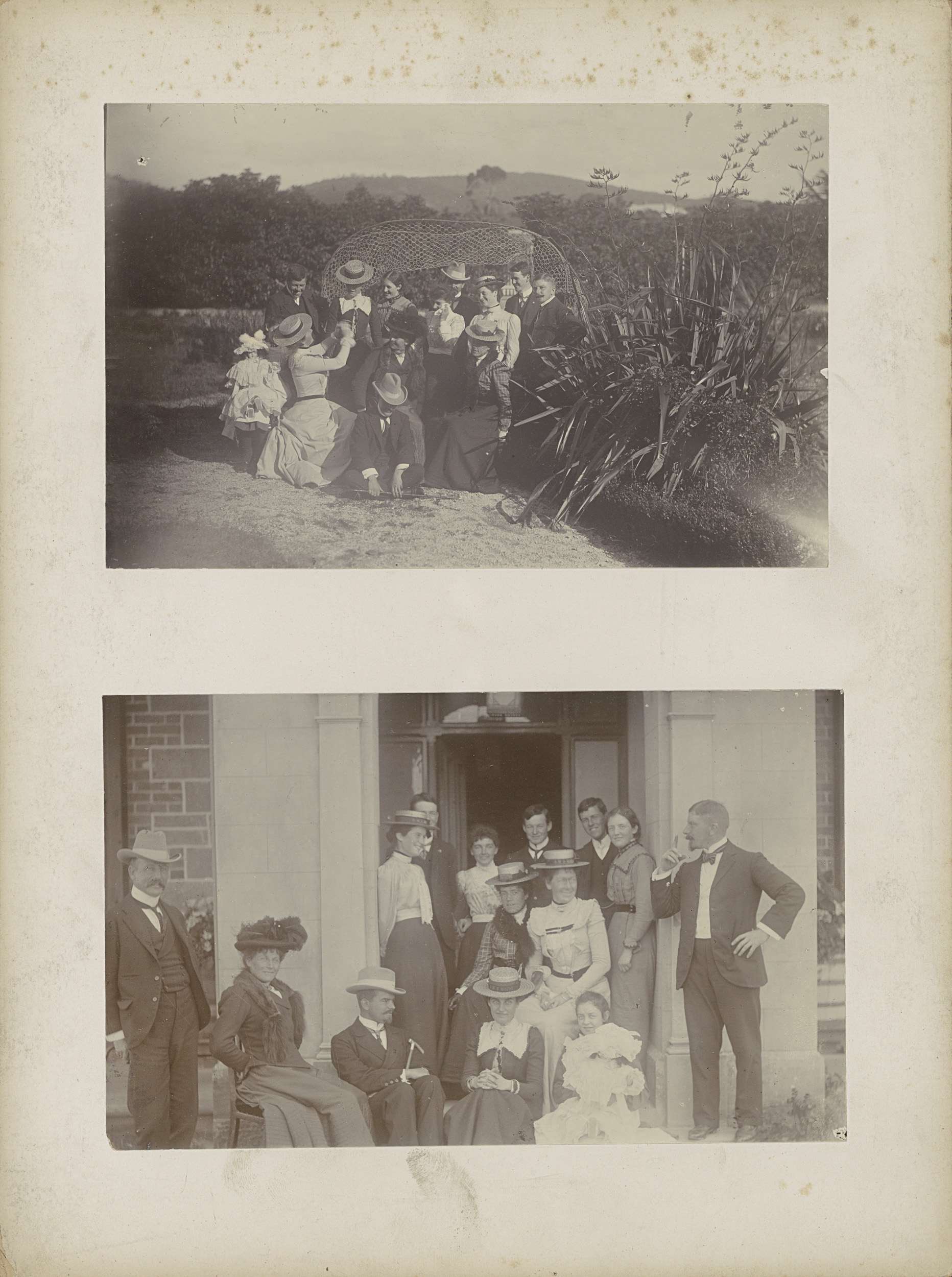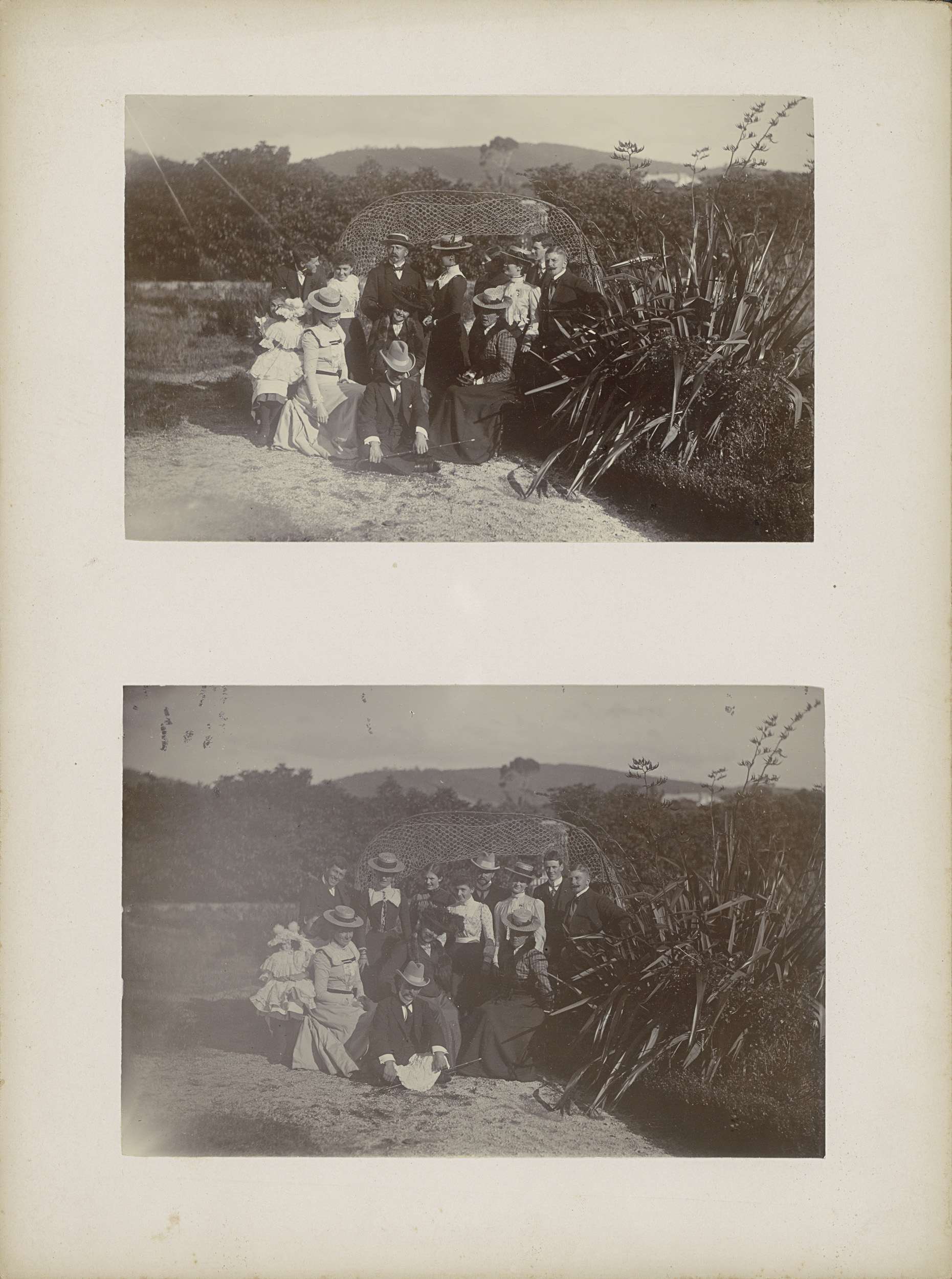 Groepsportret van mannen en vrouwen in een tuin, ver...