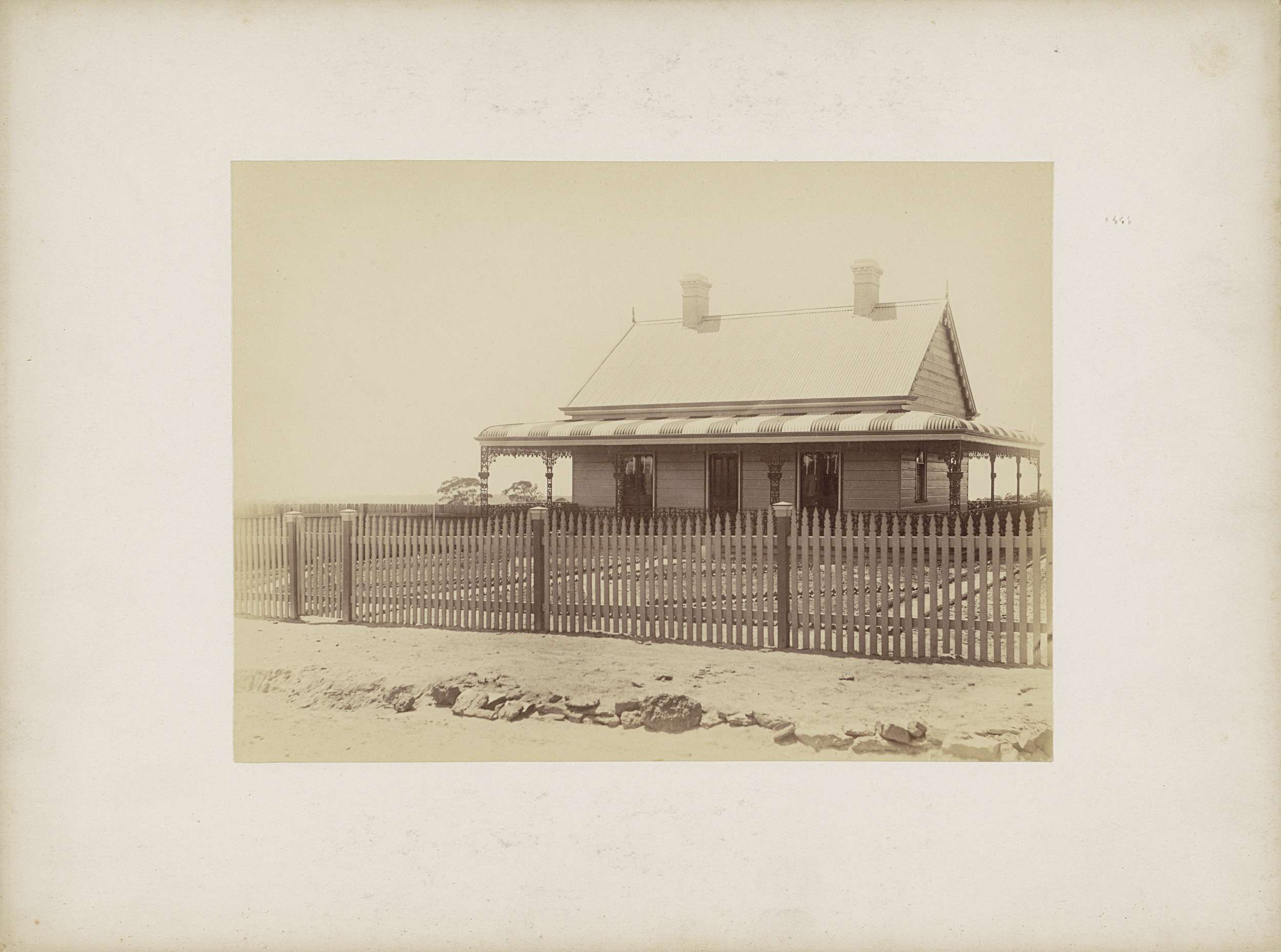 Houten huis met een erf en een hek, vermoedelijk in ...