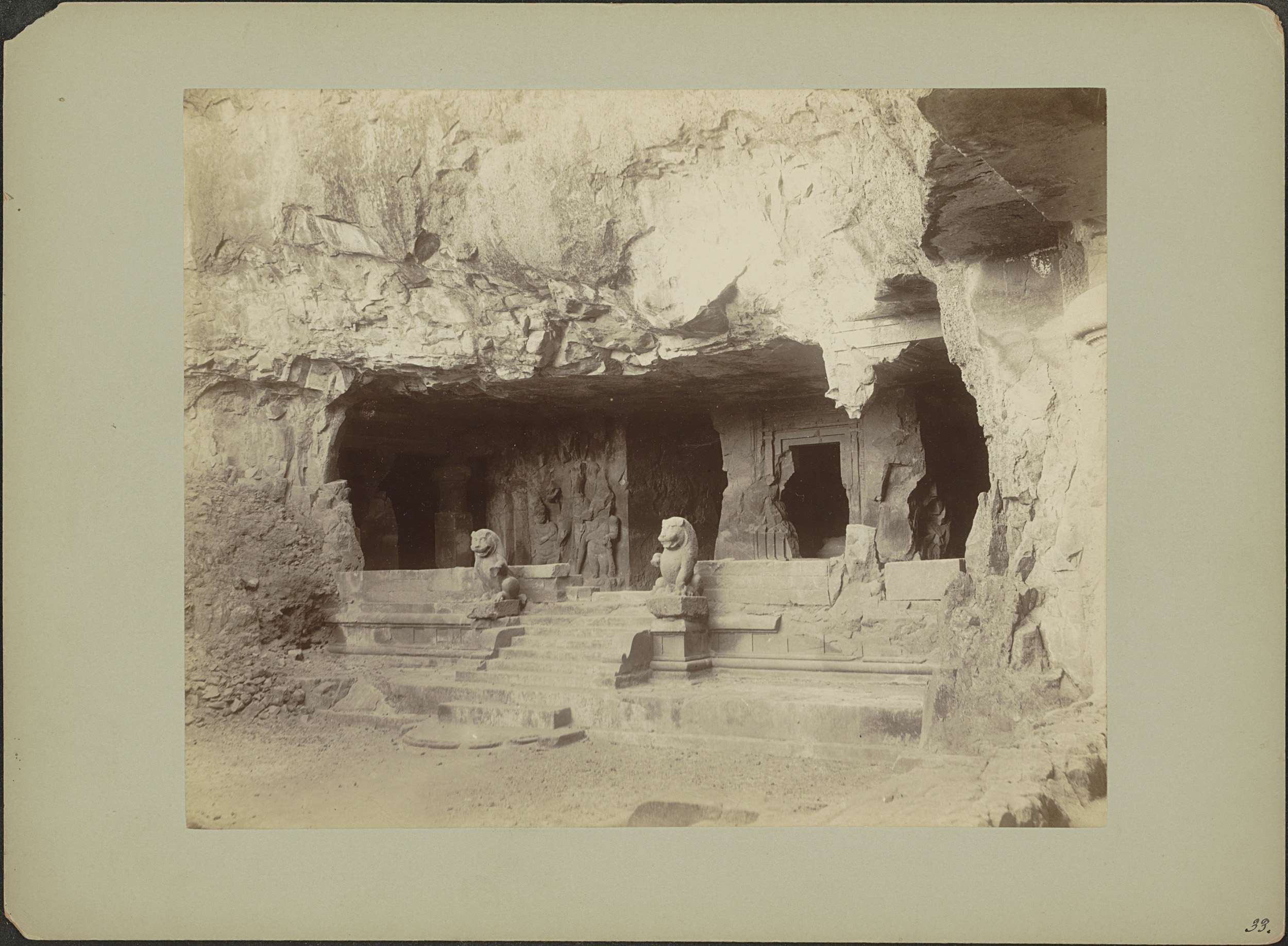 Ingang van een grottempel op Elephanta met leeuwenbe...