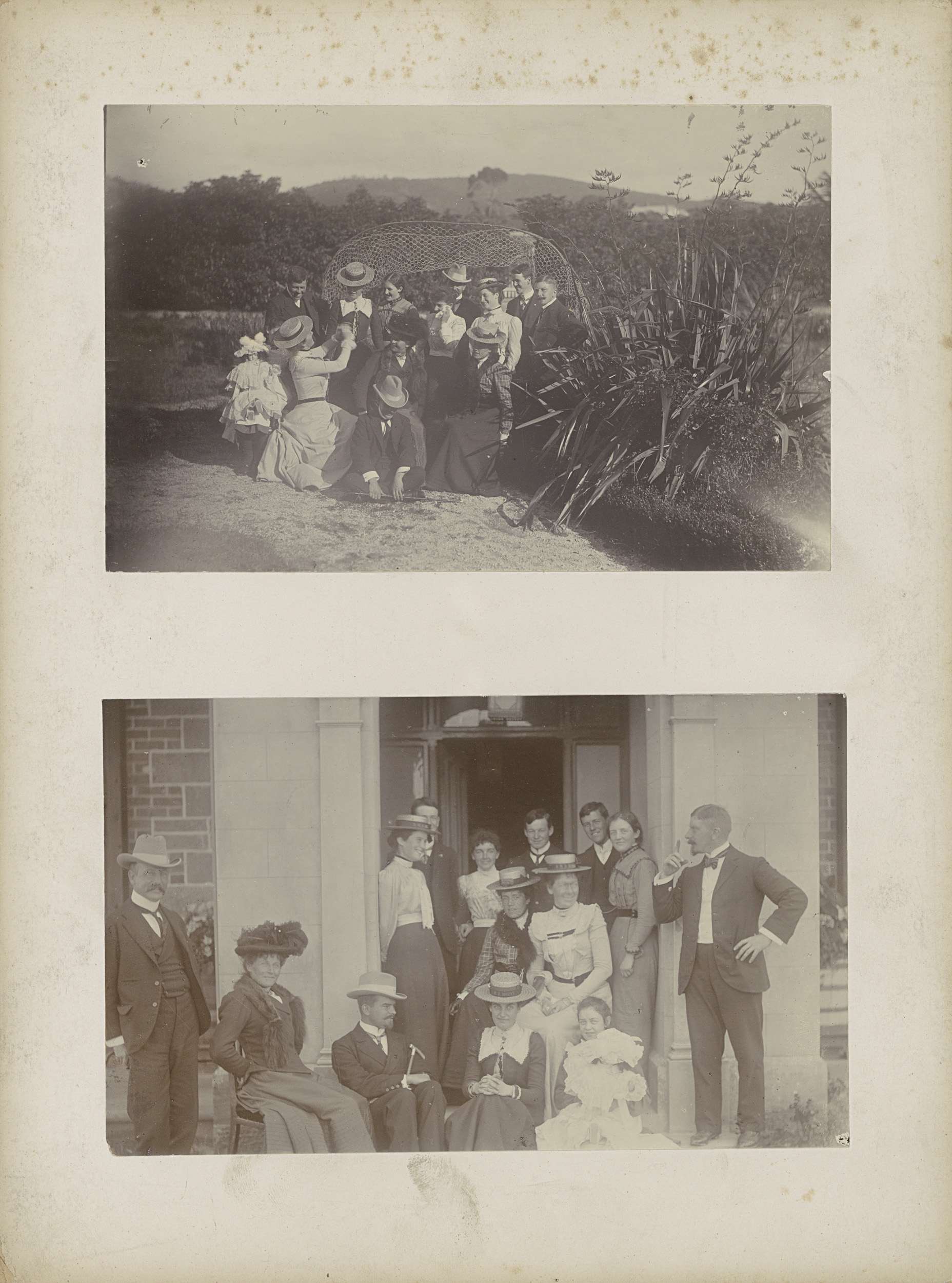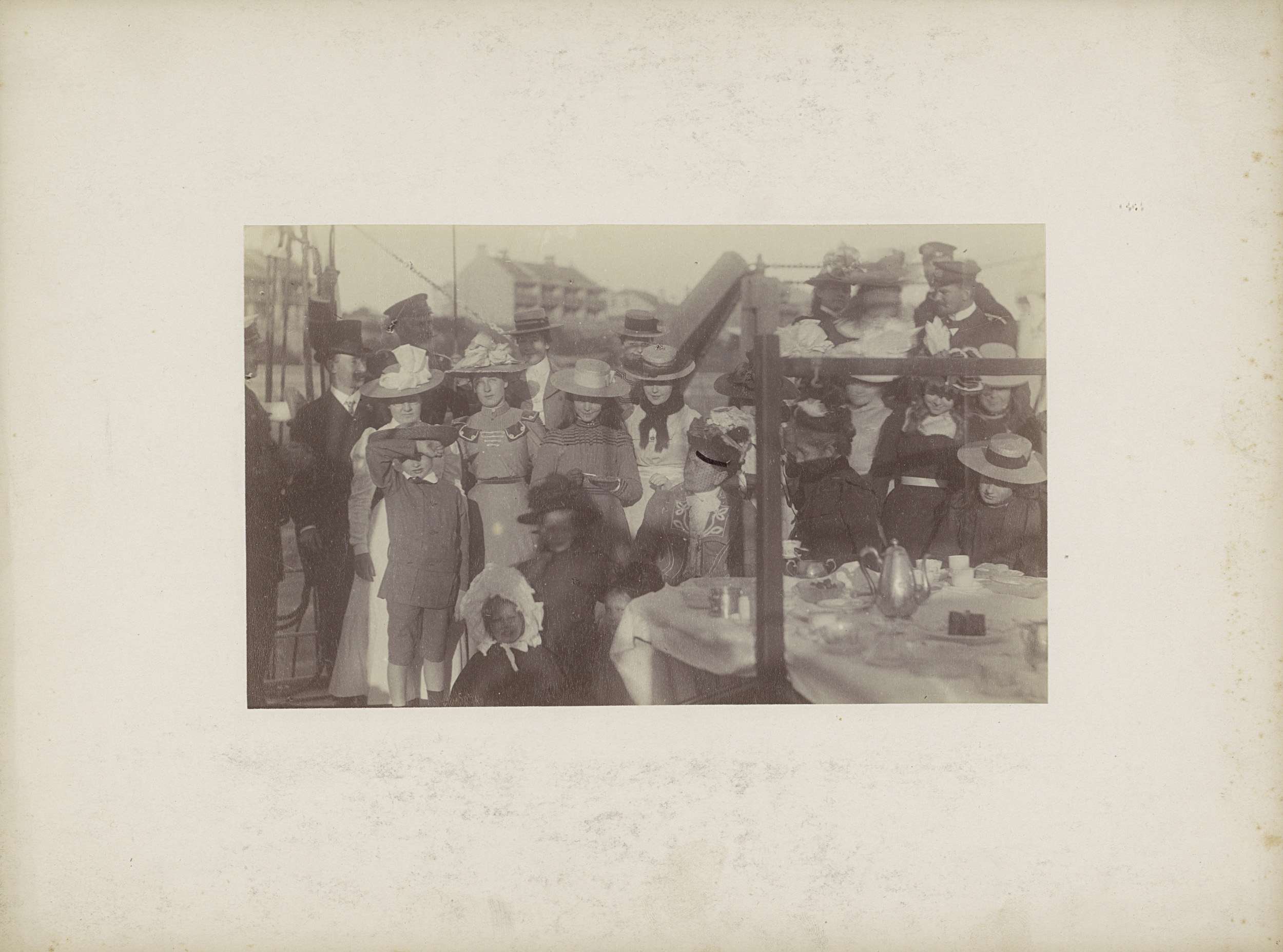 Groepsportret van vrouwen, mannen en kinderen bij ee...