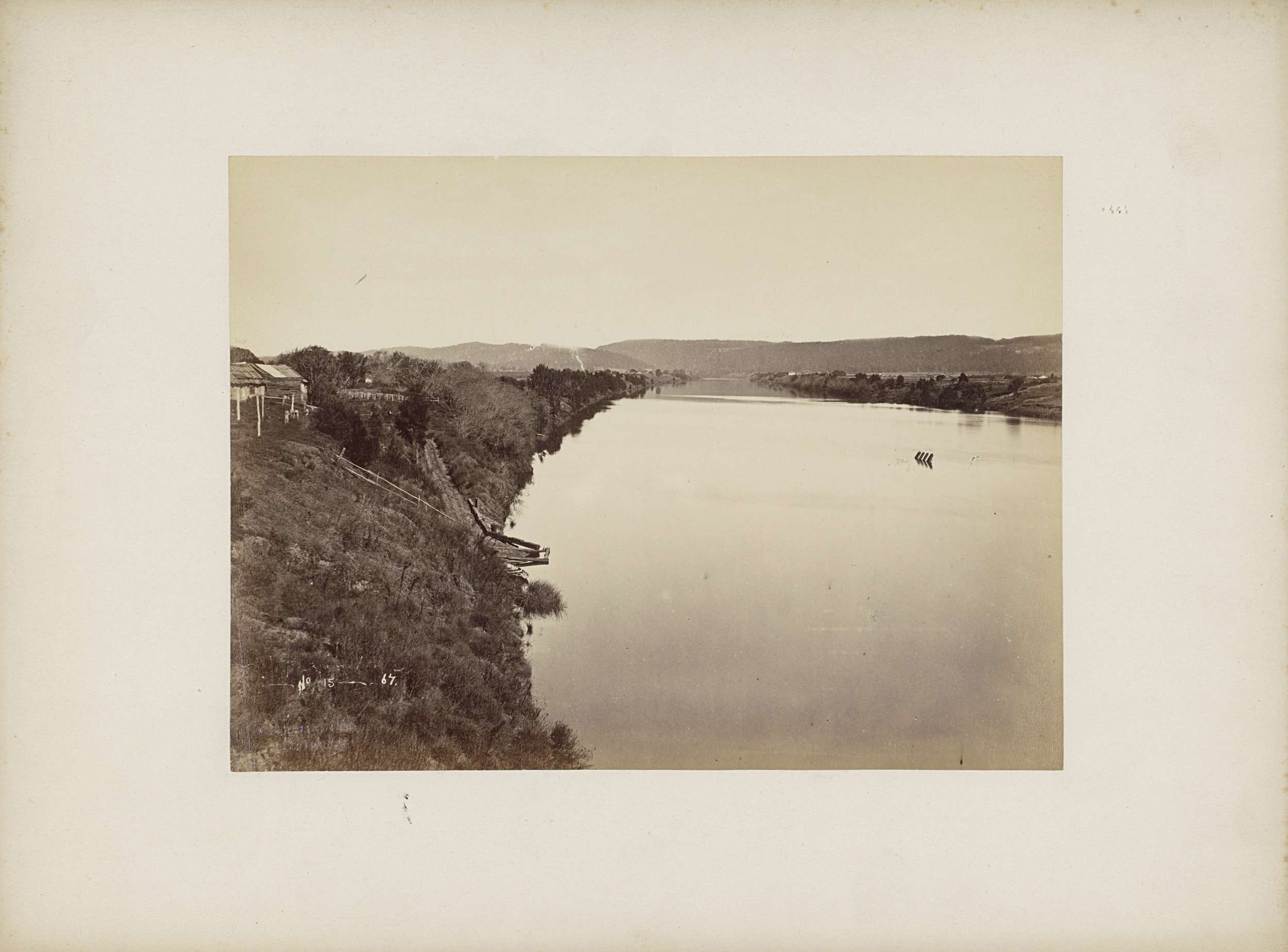 Gezicht op een rivier en oevers, vermoedelijk in de ...